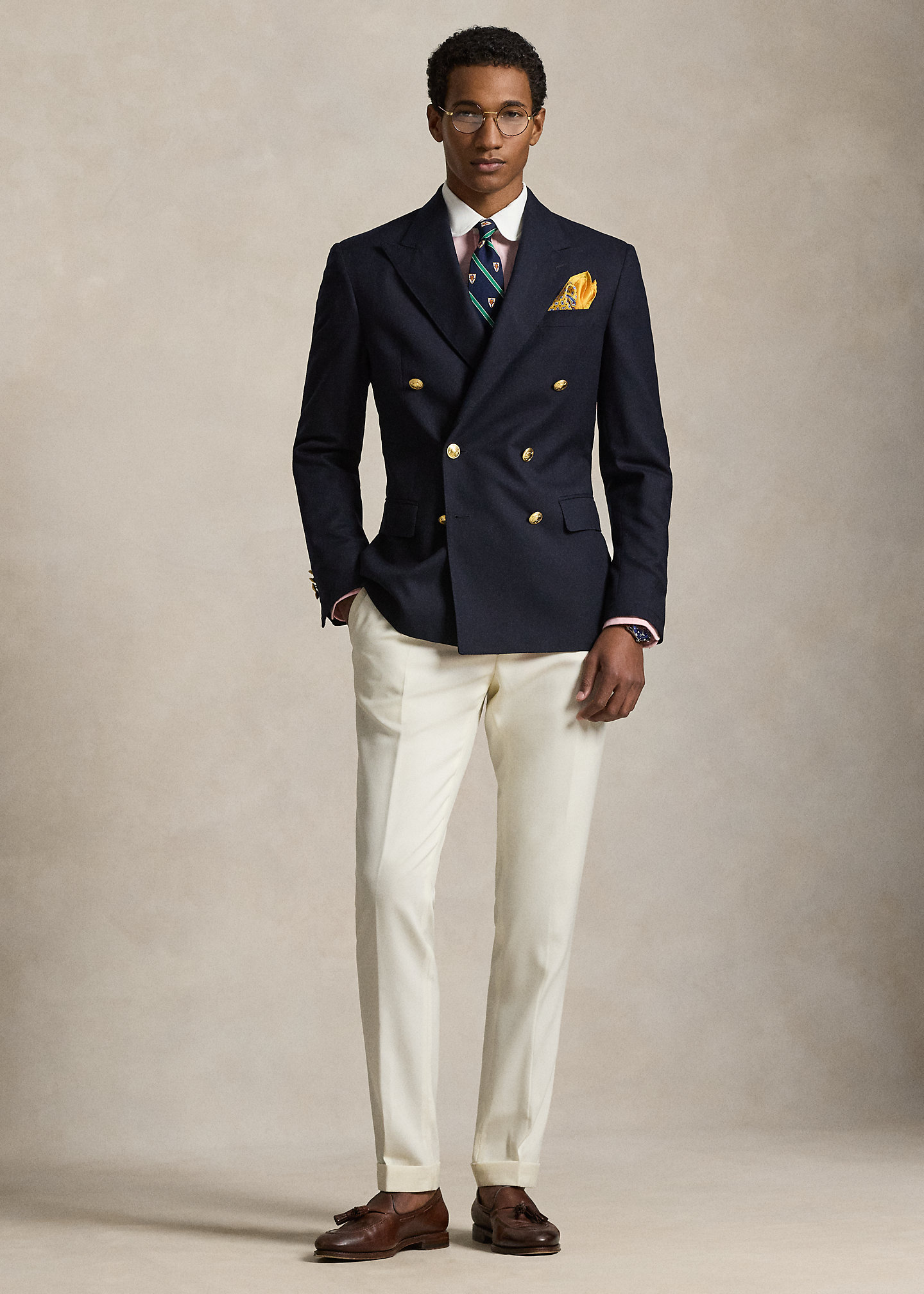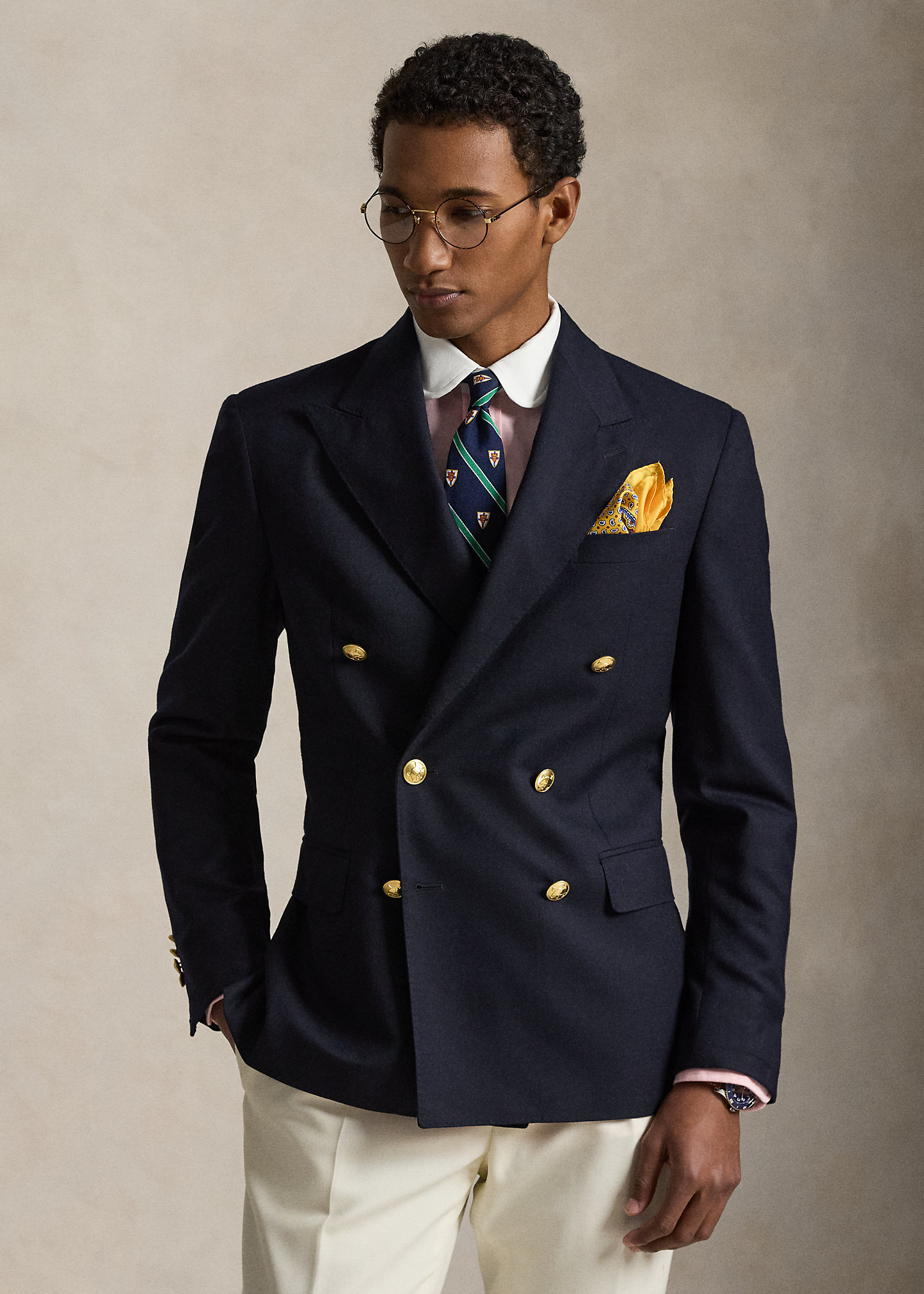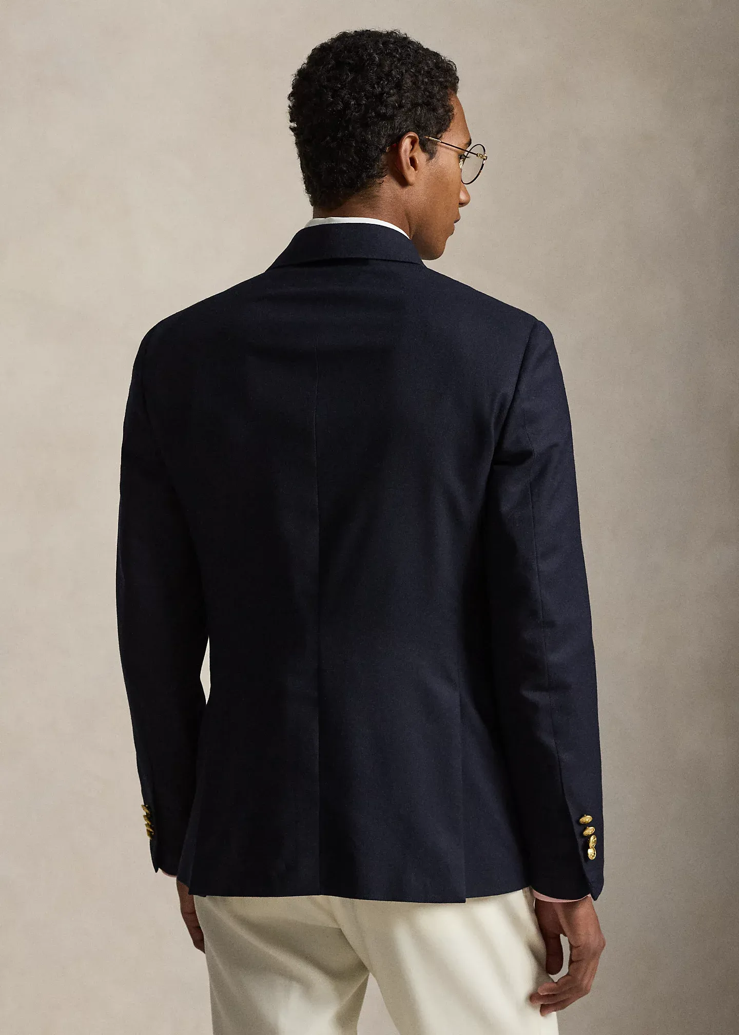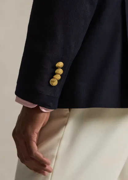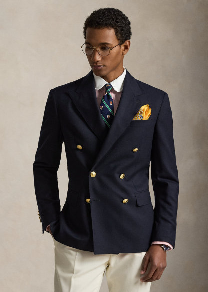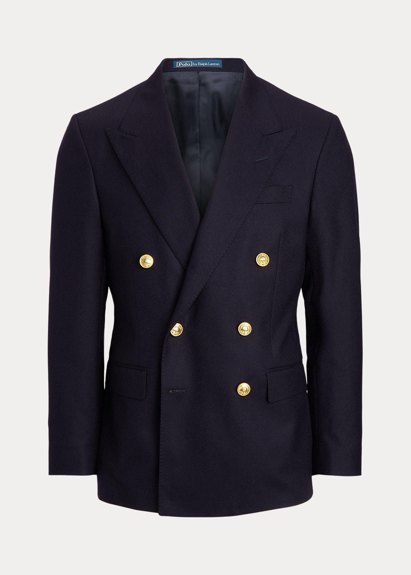 - Peak lapels. Double-breasted silhouette. Gold-tone buttons. Cuffs with four decorative buttons.