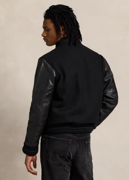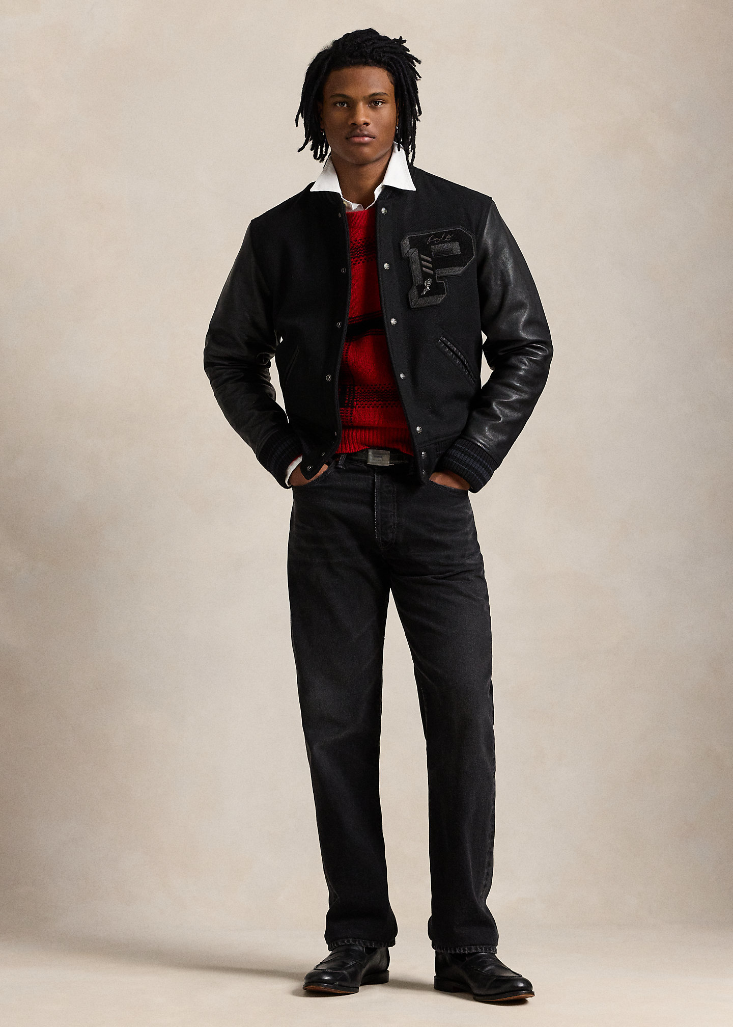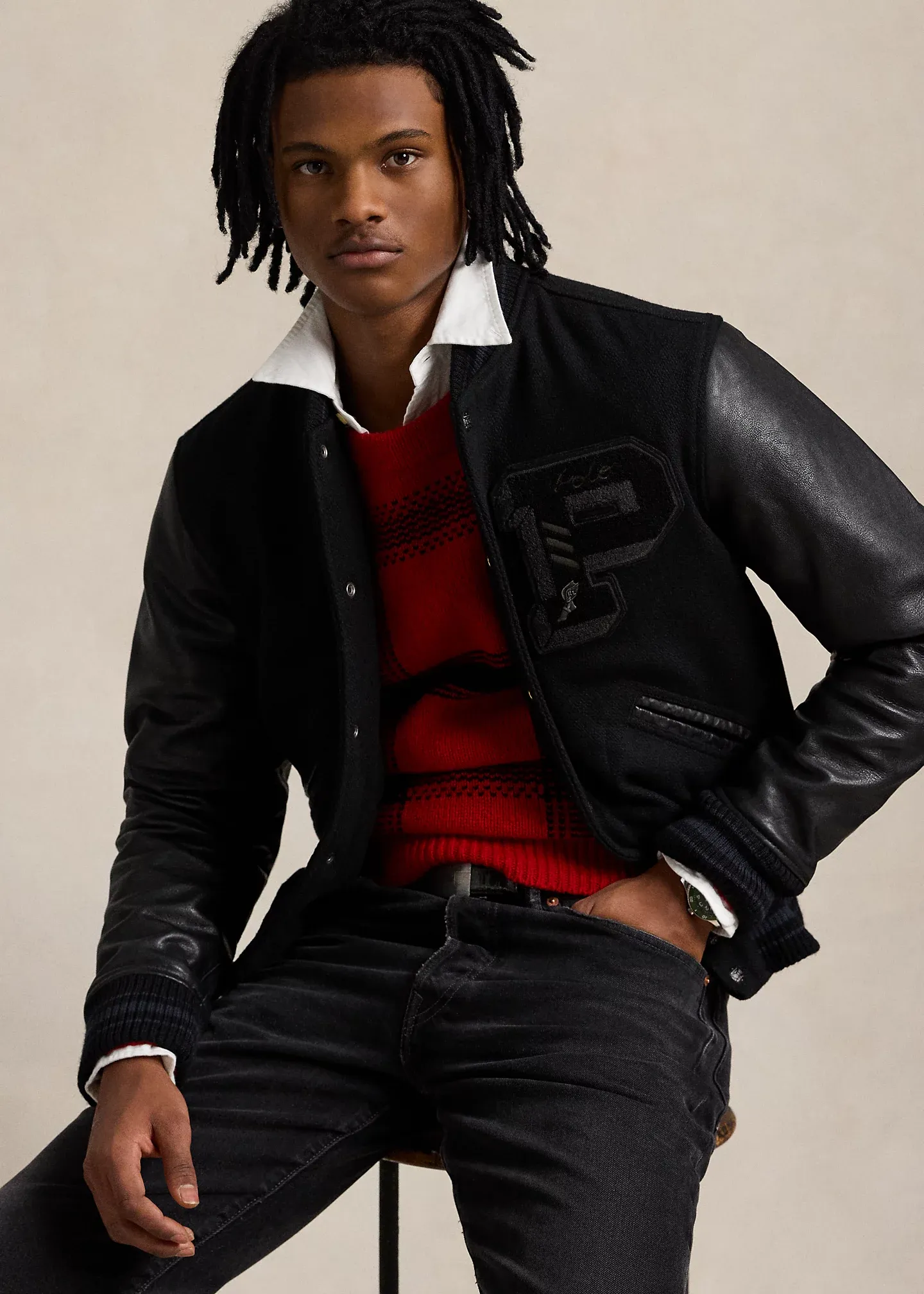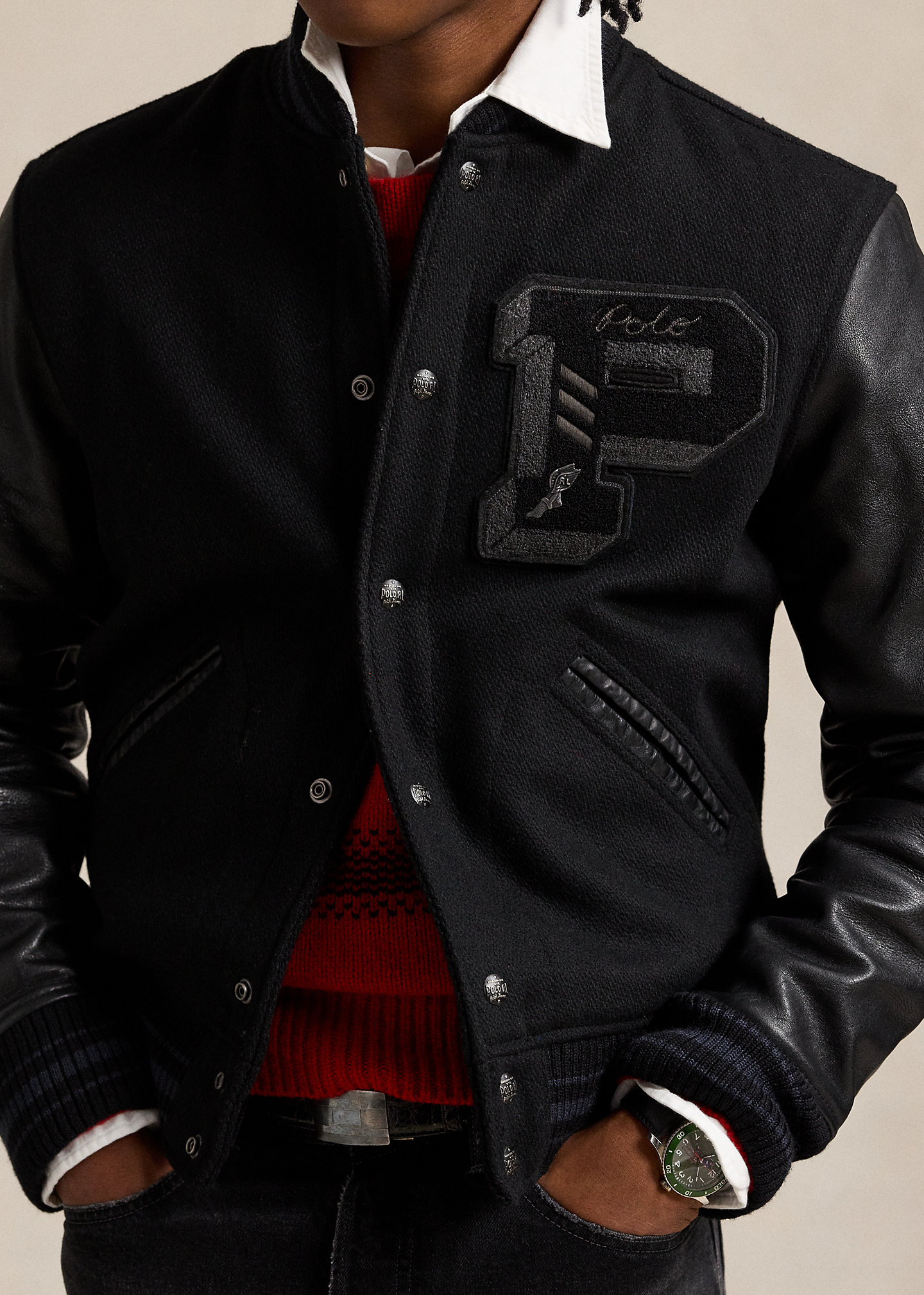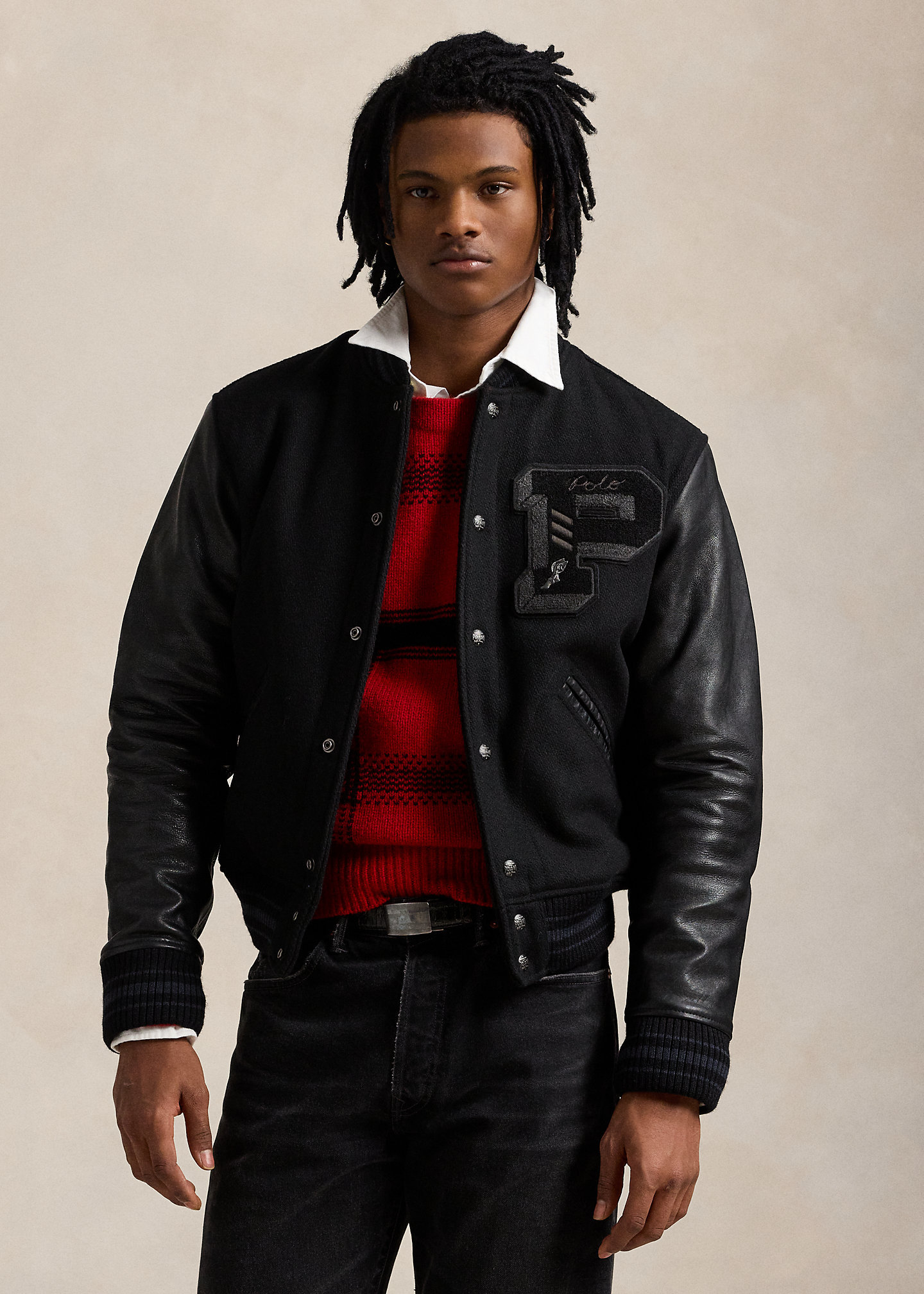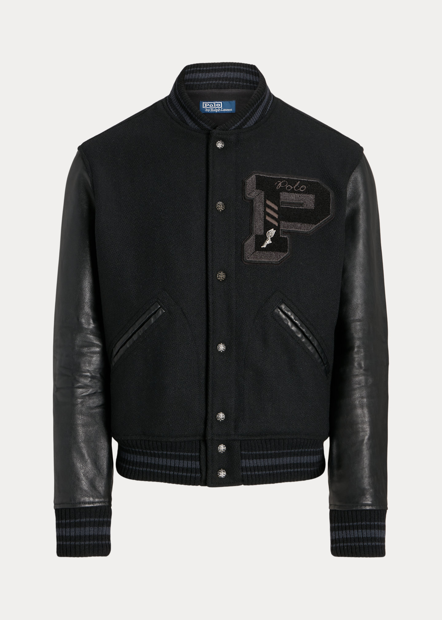 - Chenille "P" patch with a metal "RL" winged-foot detail at the left chest. Two front waist welt pockets with leather trim. Interior left waist pocket. Striped ribbed hem. Fully lined.