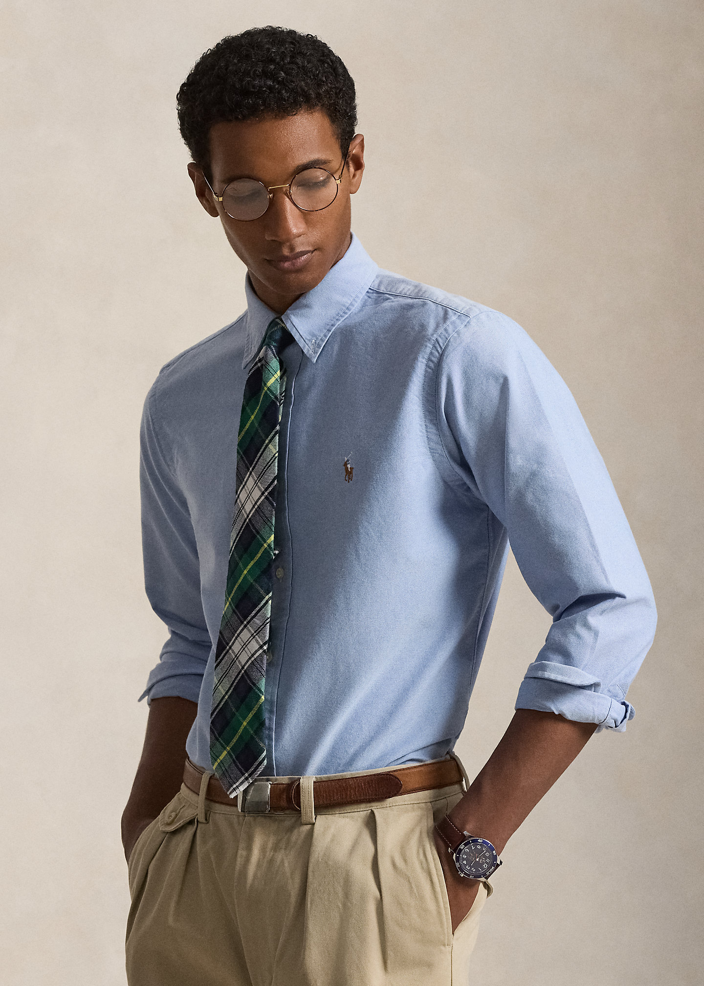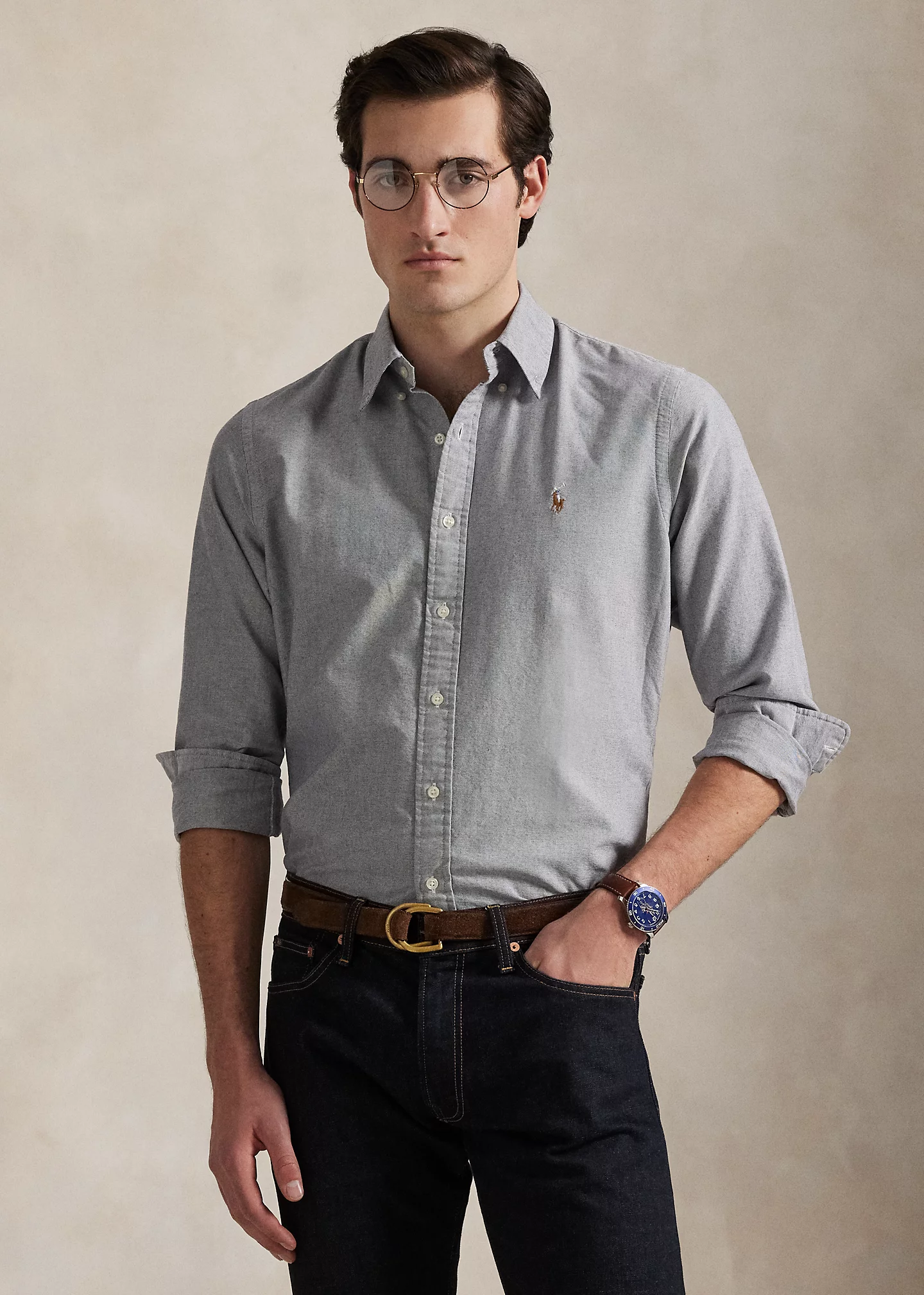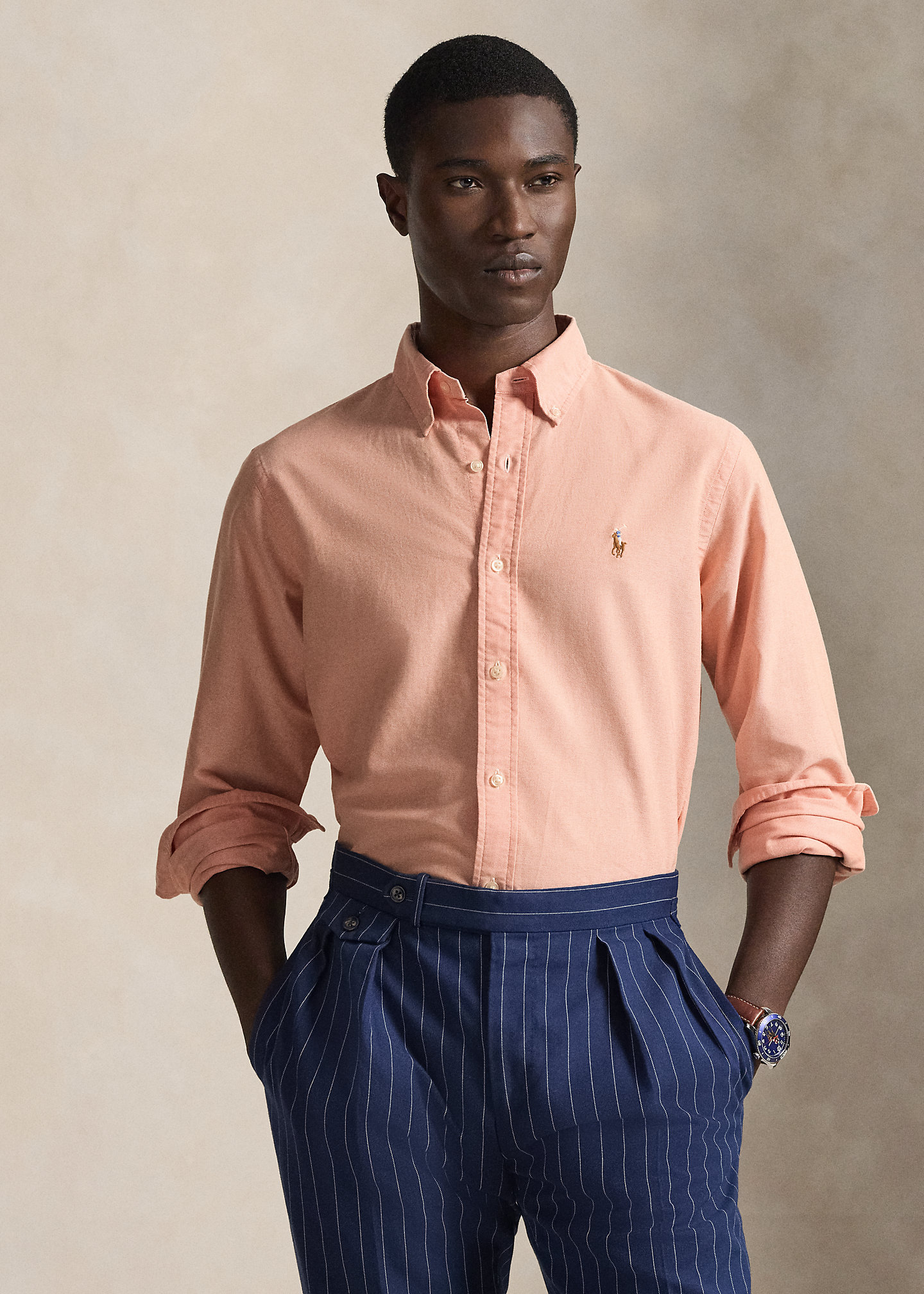 - Button-down collar. Buttoned placket.
