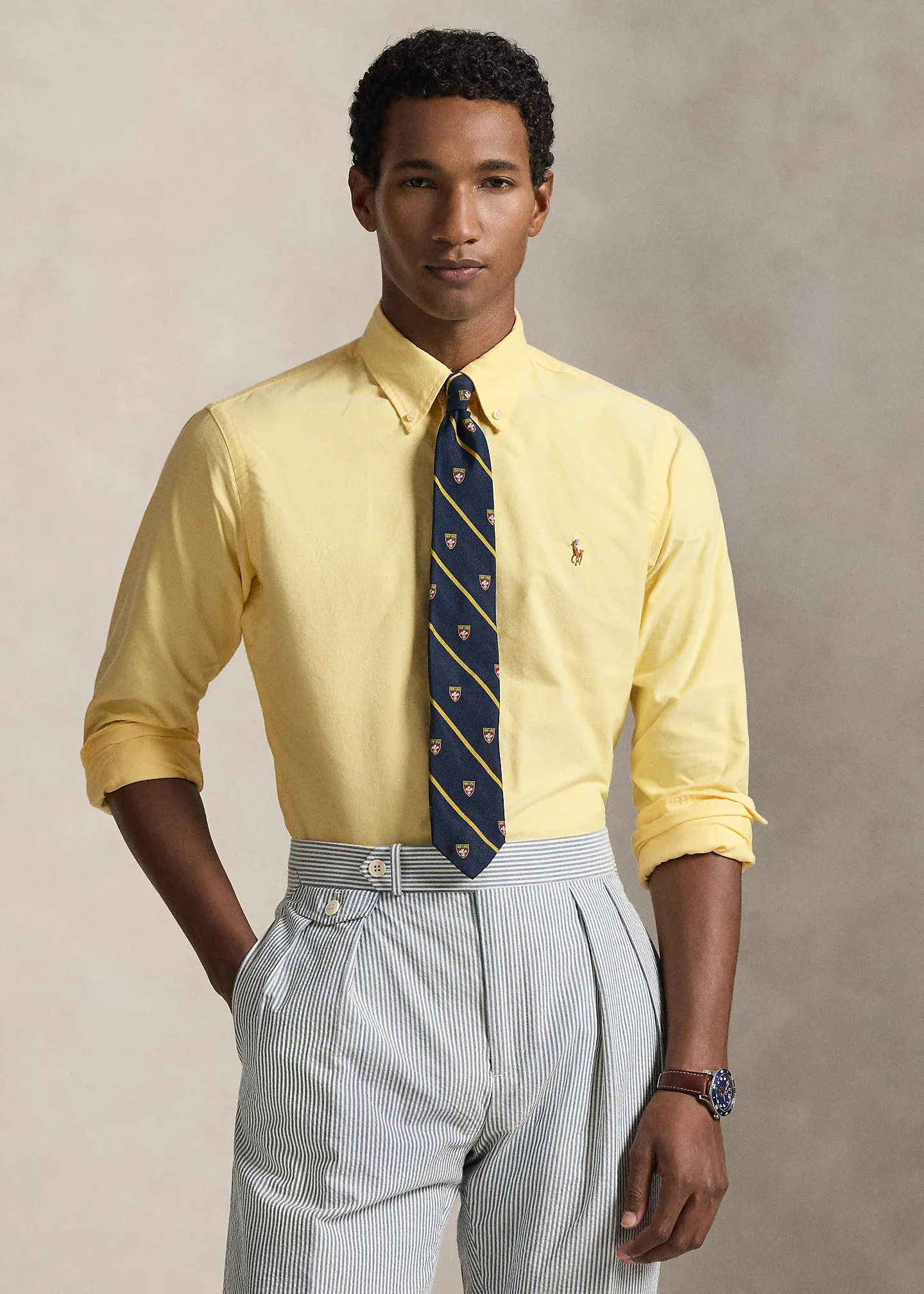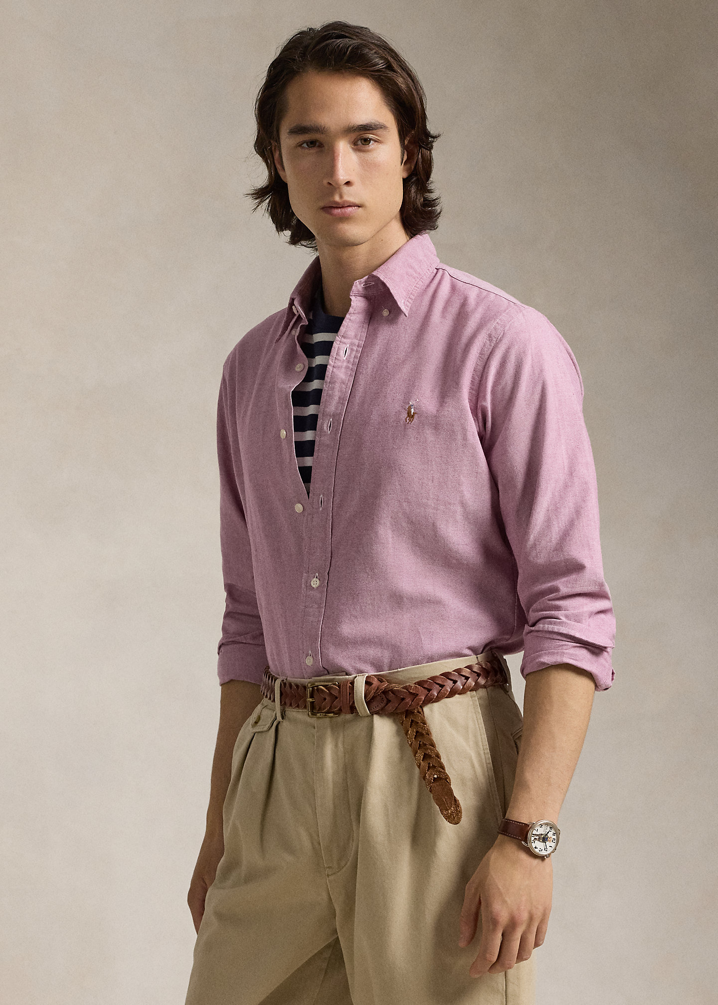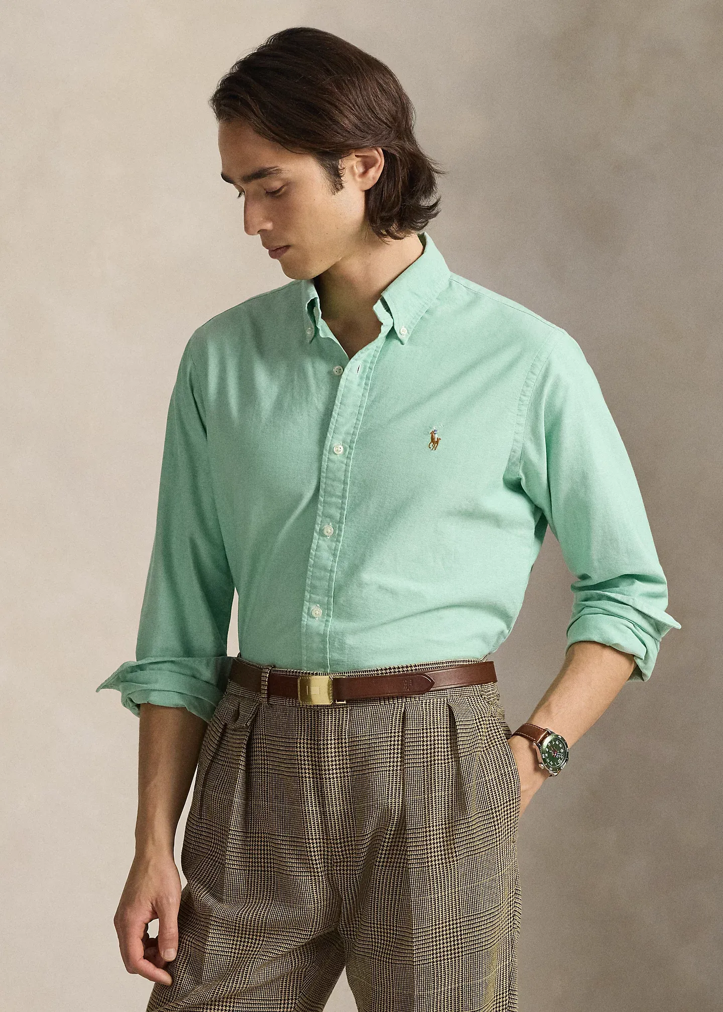 - Button-down collar. Buttoned placket.