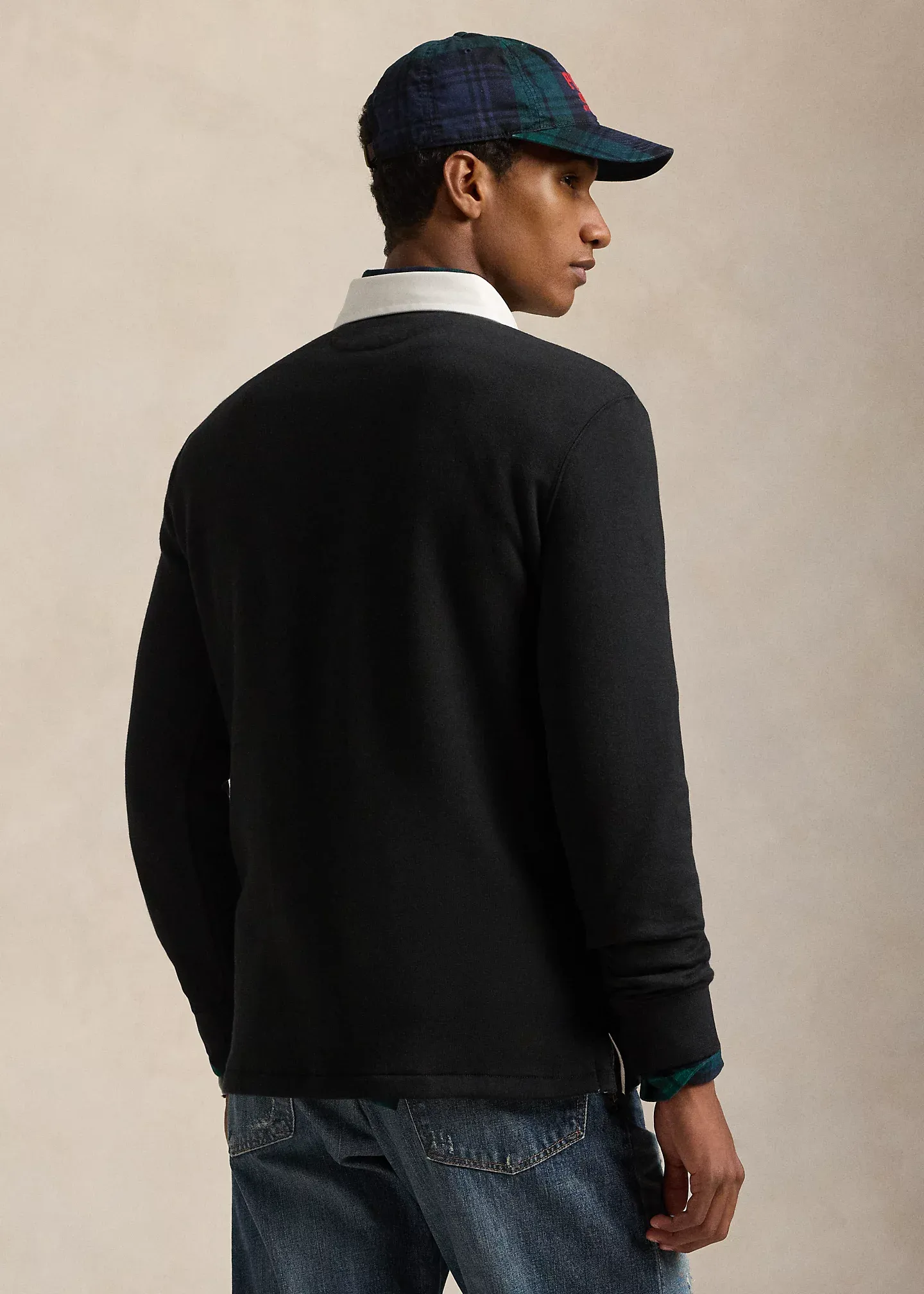 - Twill rugby collar. Three-button placket. Rubber buttons.