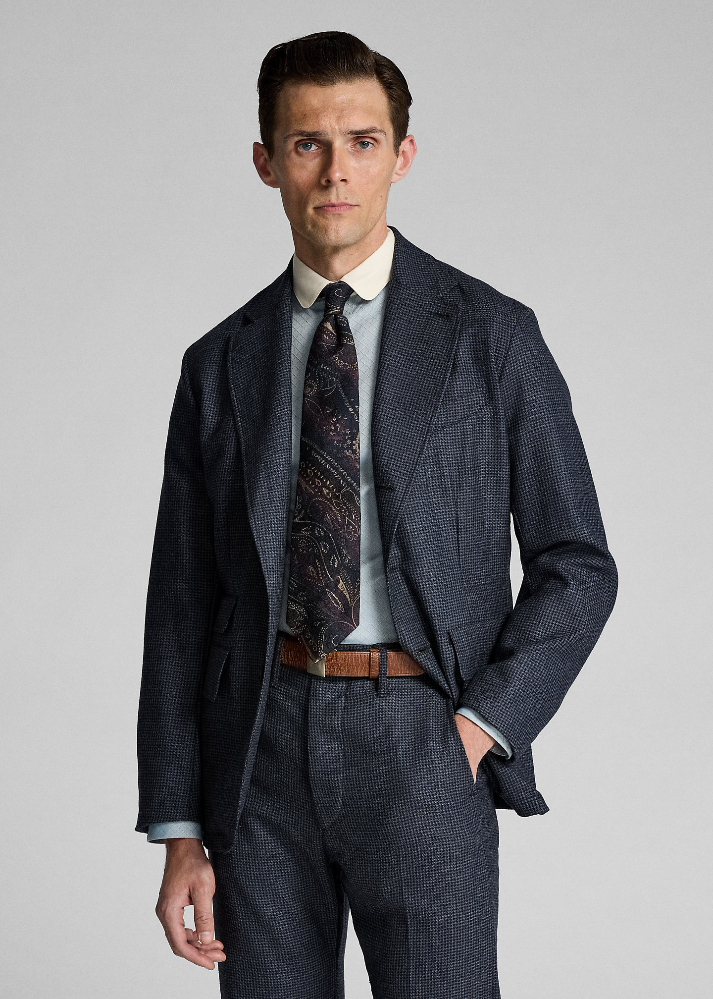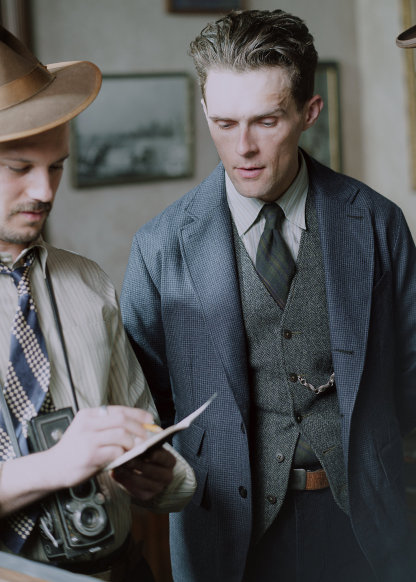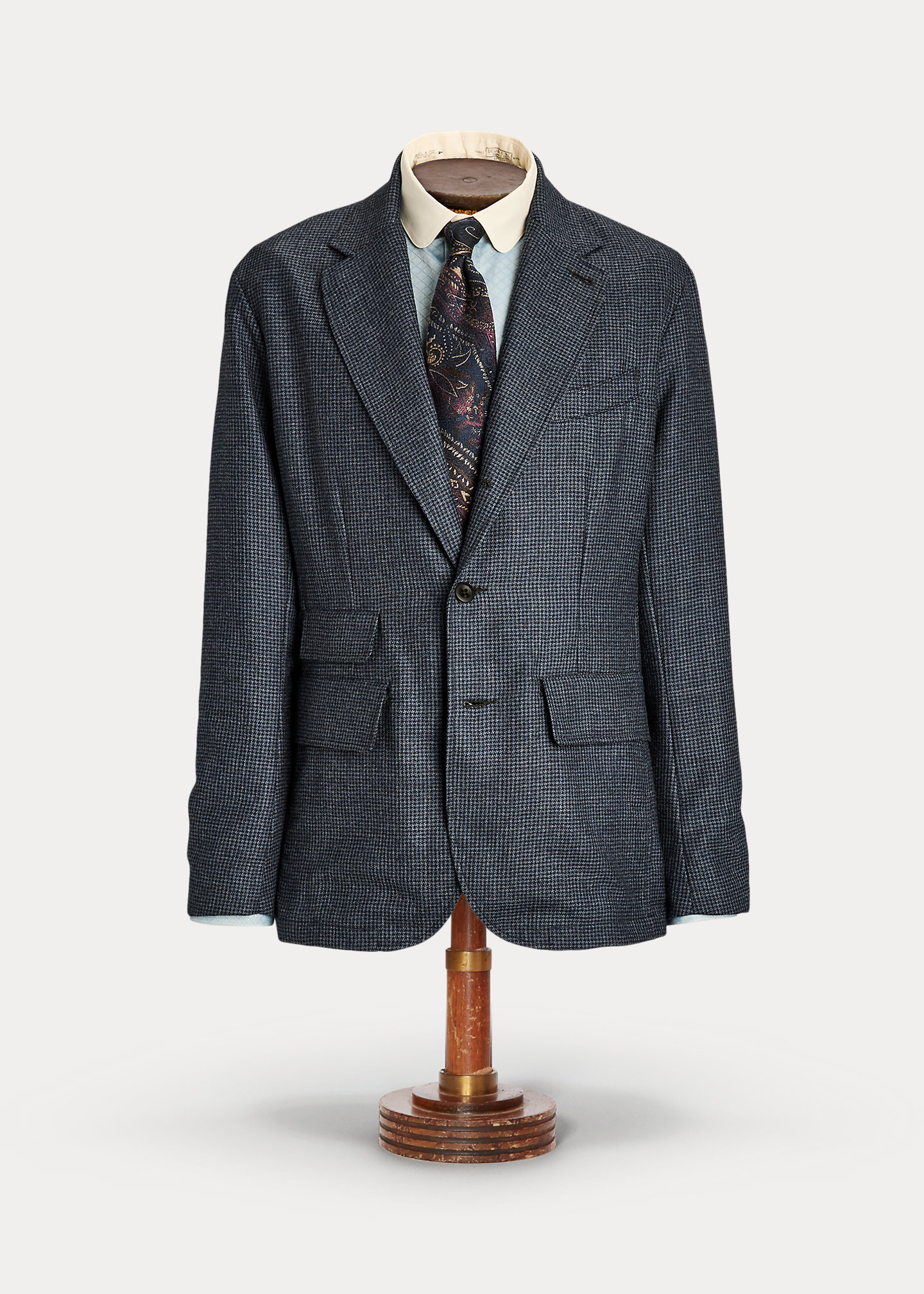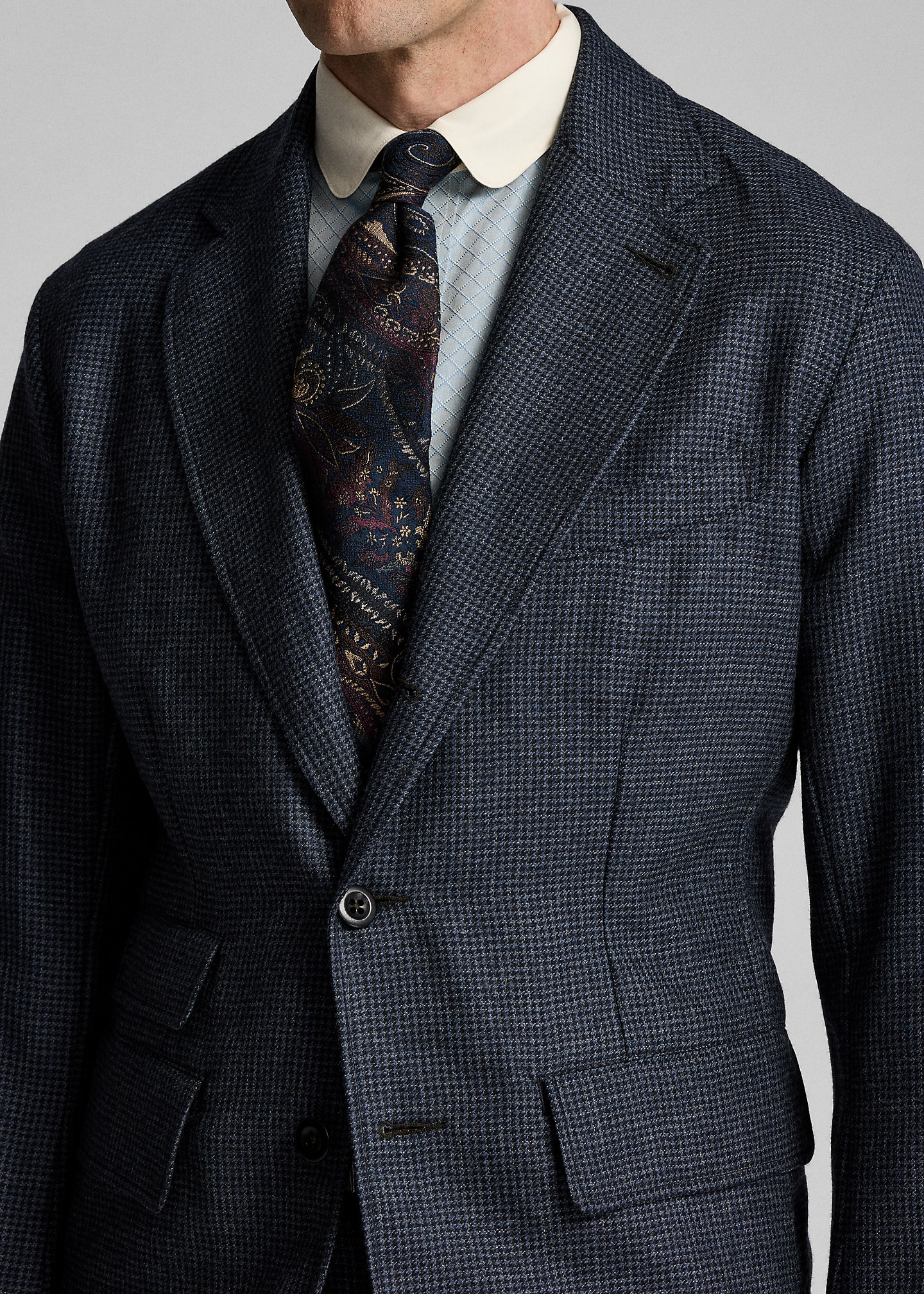 - Notch lapels. Buttonhole at the left lapel. Three-roll-two silhouette. Corozo buttons.