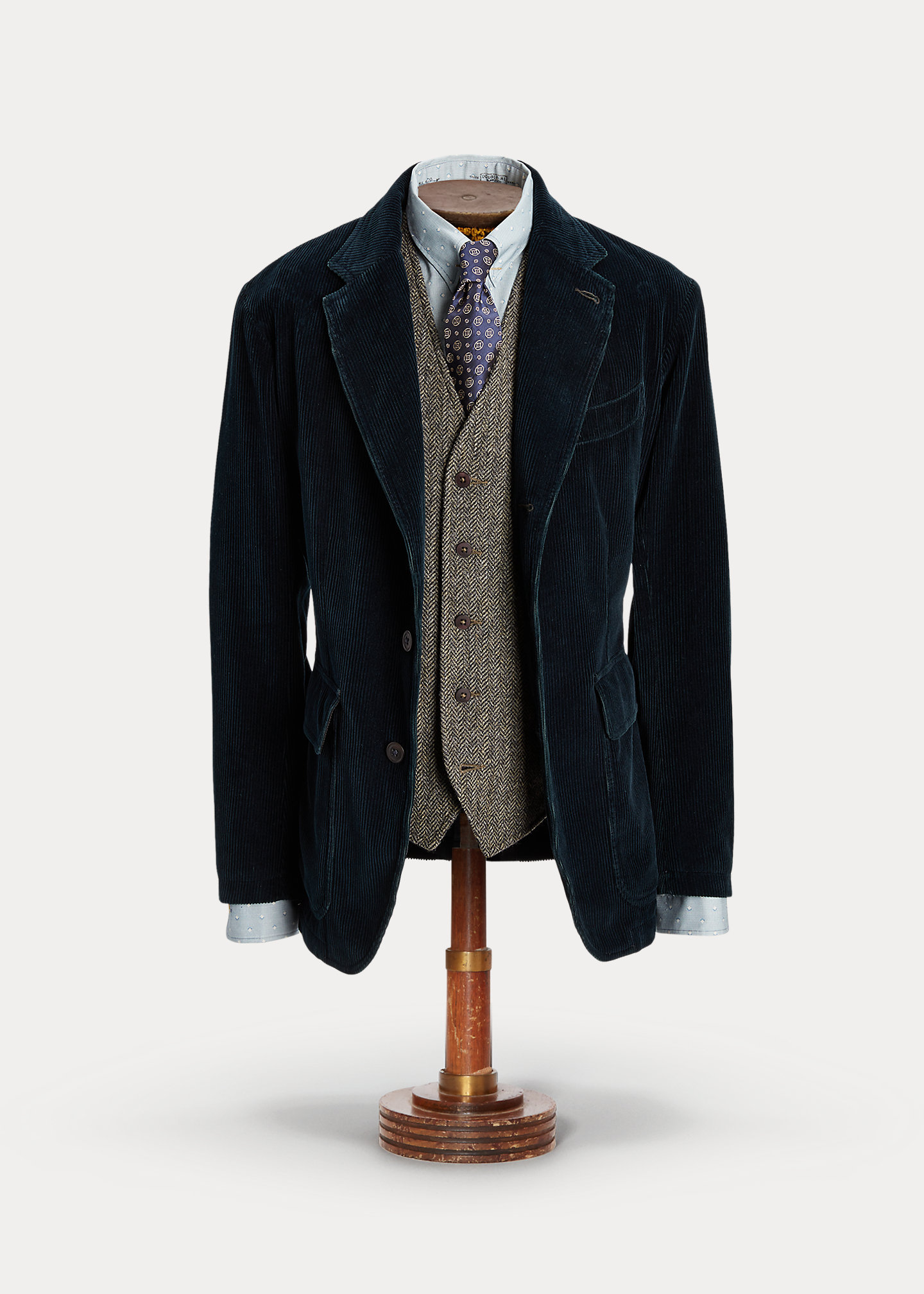 - Notch lapels. Buttonhole at the left lapel. Three-roll-two silhouette. Corozo buttons.