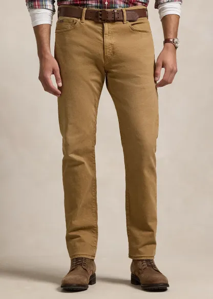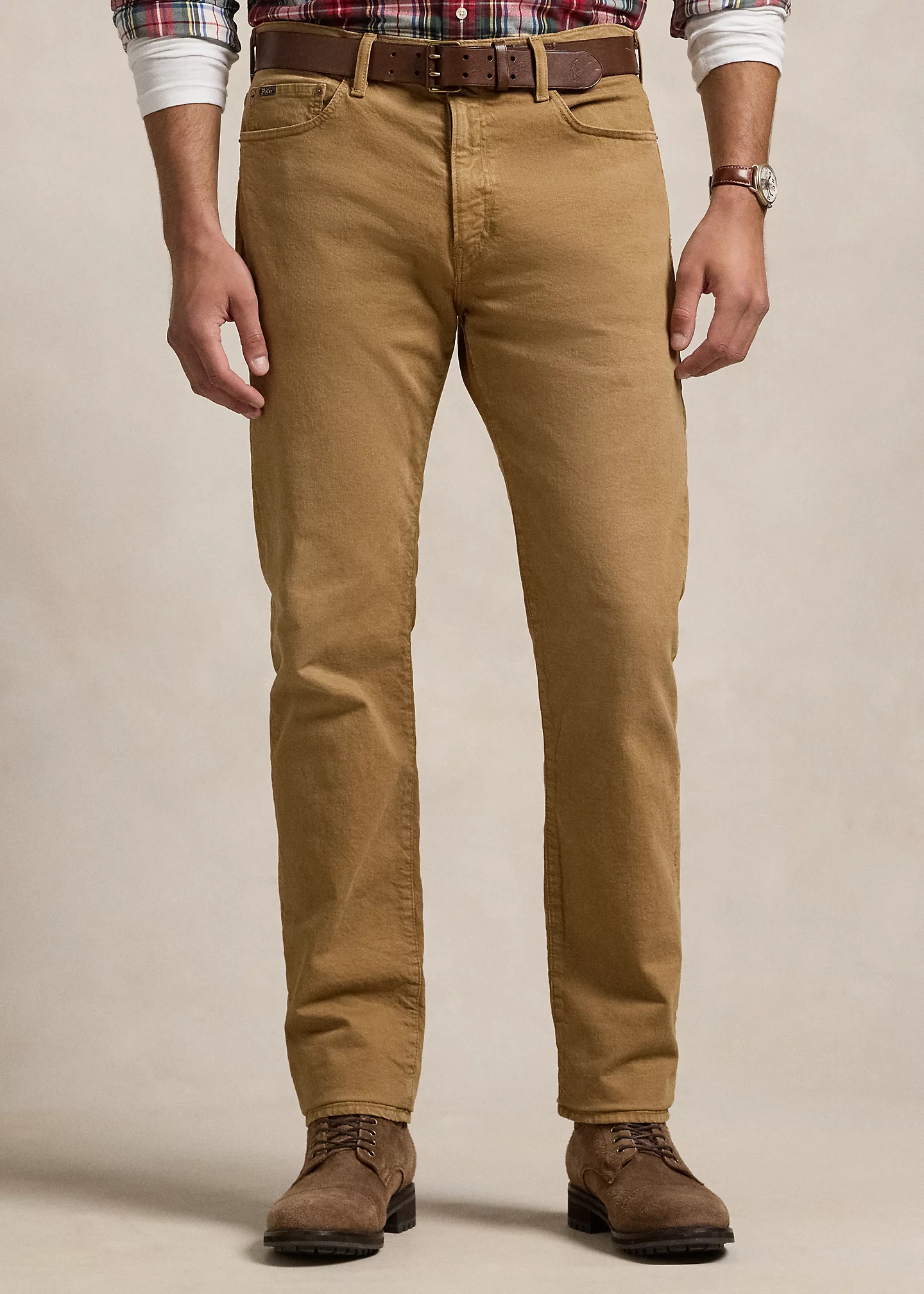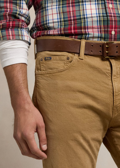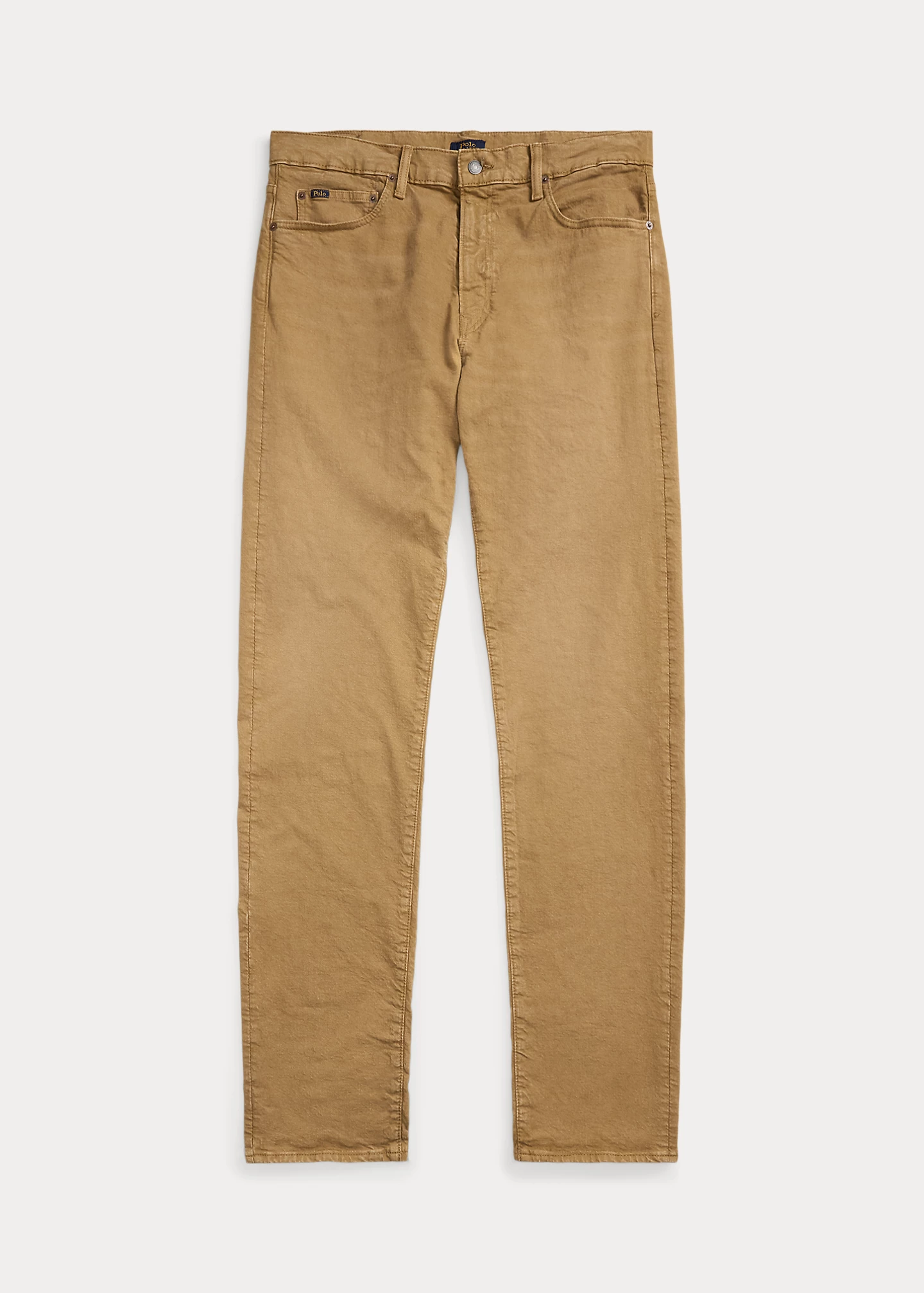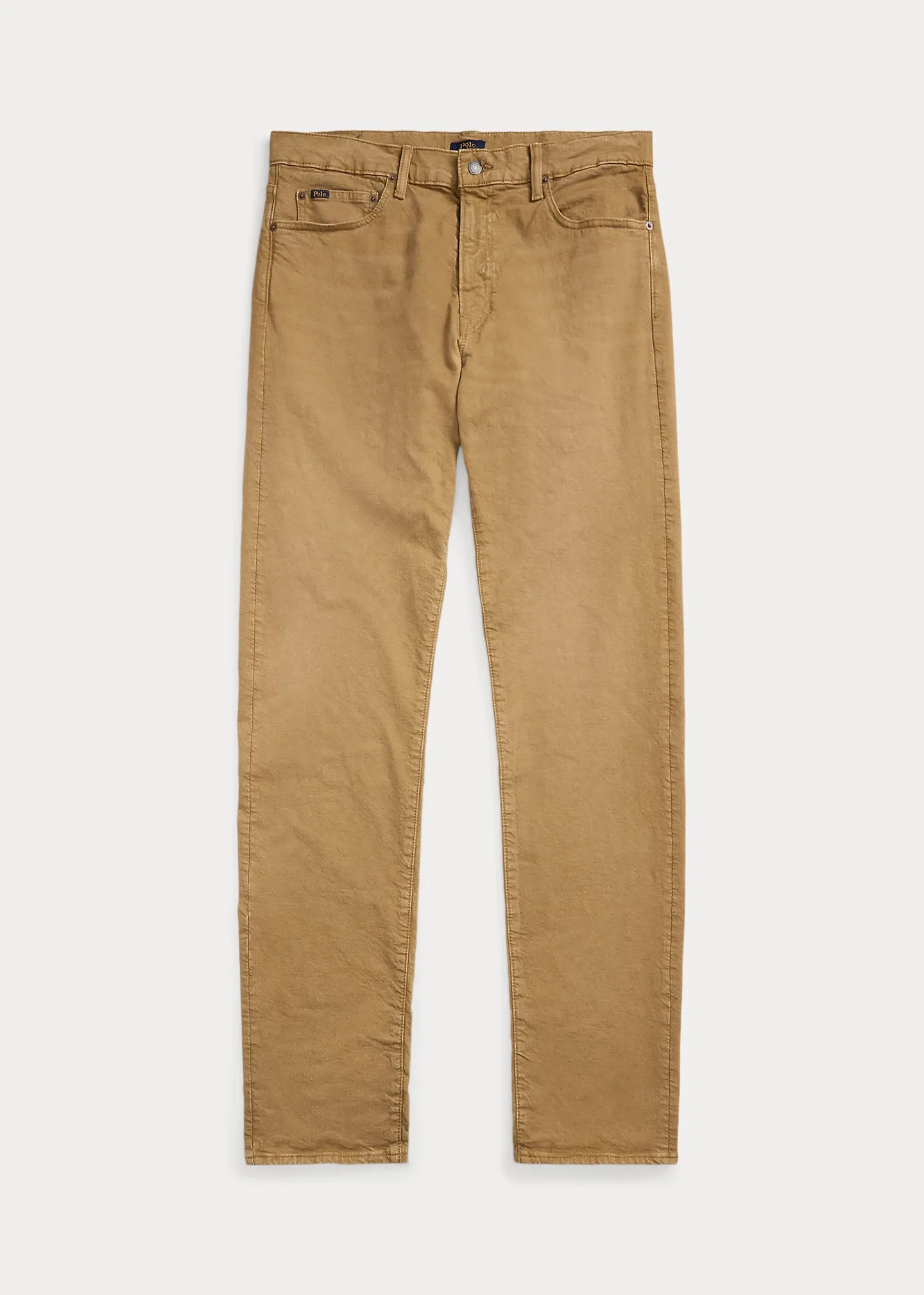 - Five-pocket styling with signature metal rivets. “Polo” label at the coin pocket. Leather “Polo Ralph Lauren” patch at the back right waist.