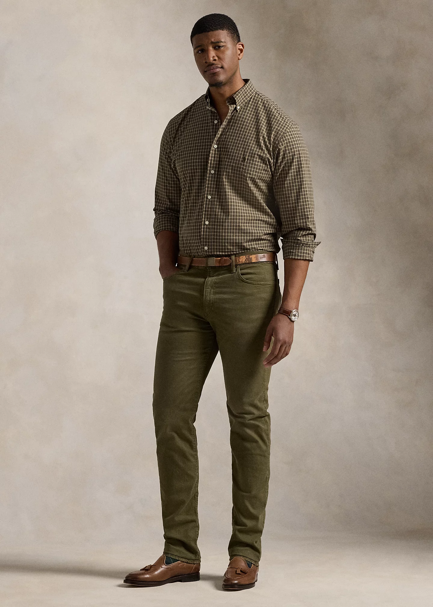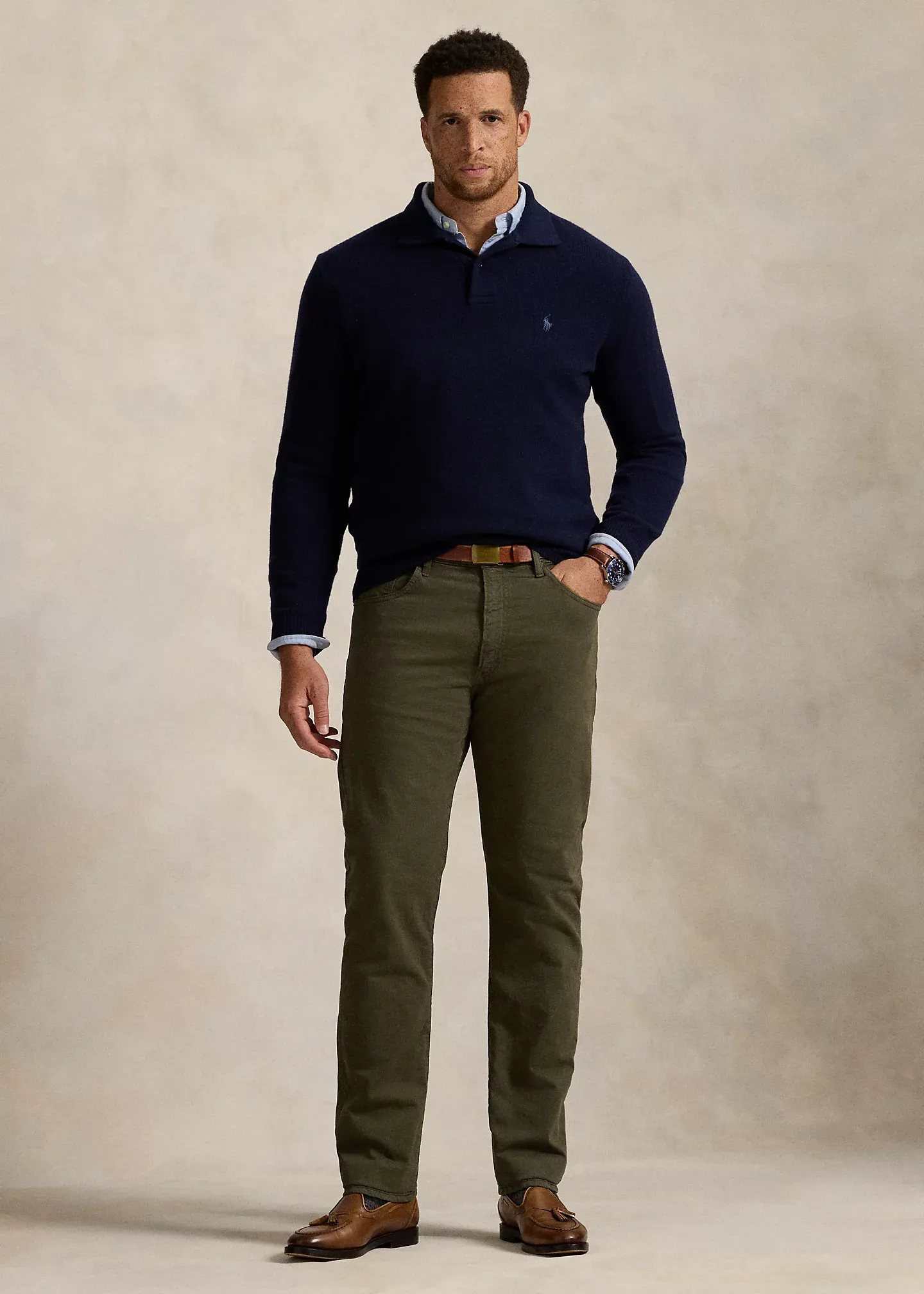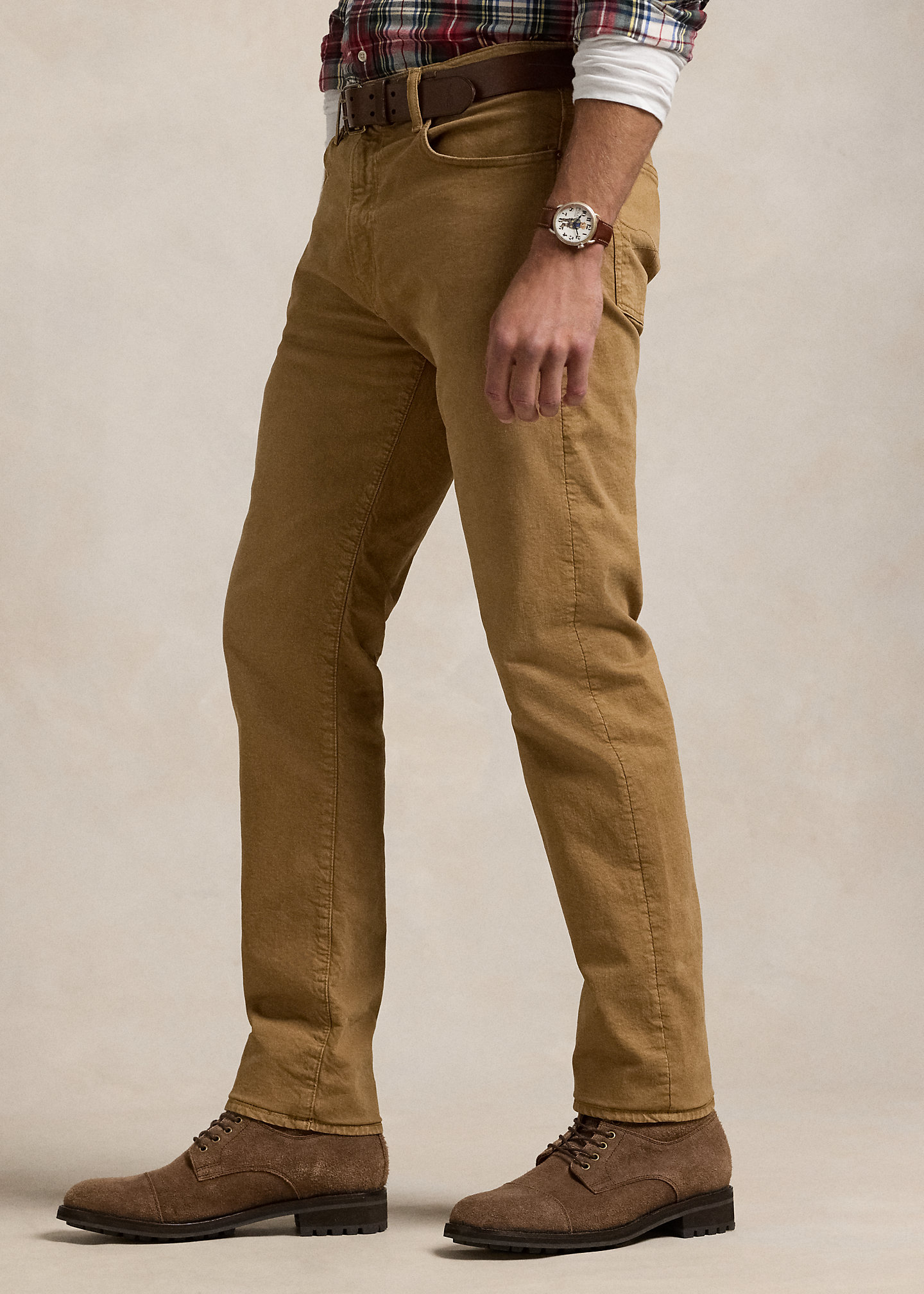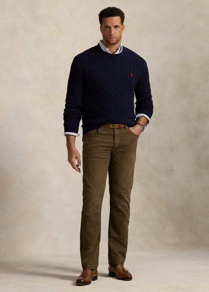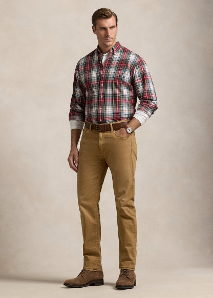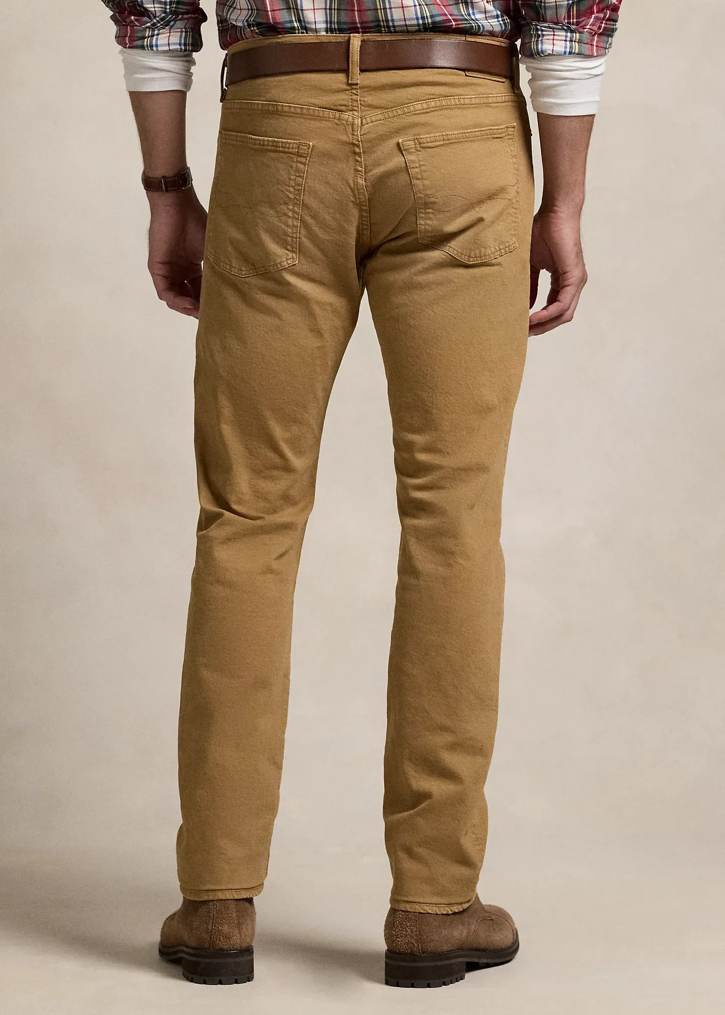 - Five-pocket styling with signature metal rivets. “Polo” label at the coin pocket. Leather “Polo Ralph Lauren” patch at the back right waist.