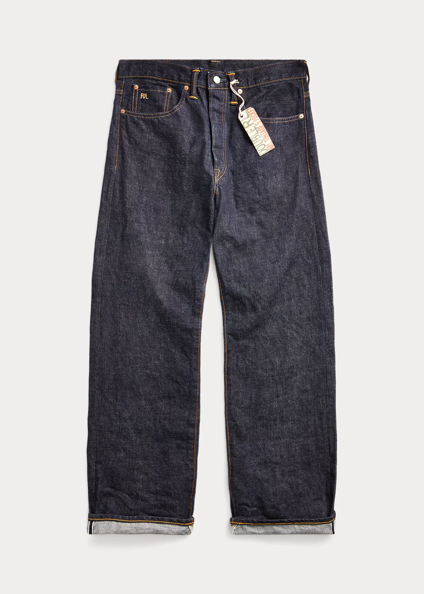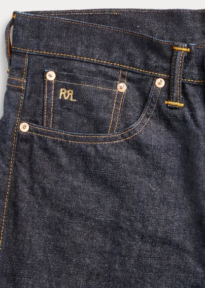 - American-made buttons, copper-tone rivets, and washer burrs. Five-pocket styling. “RRL” embroidery at the selvedge coin pocket. Natural twill pocket lining.
