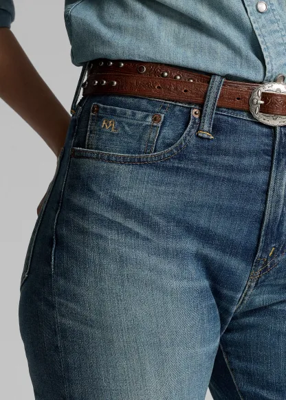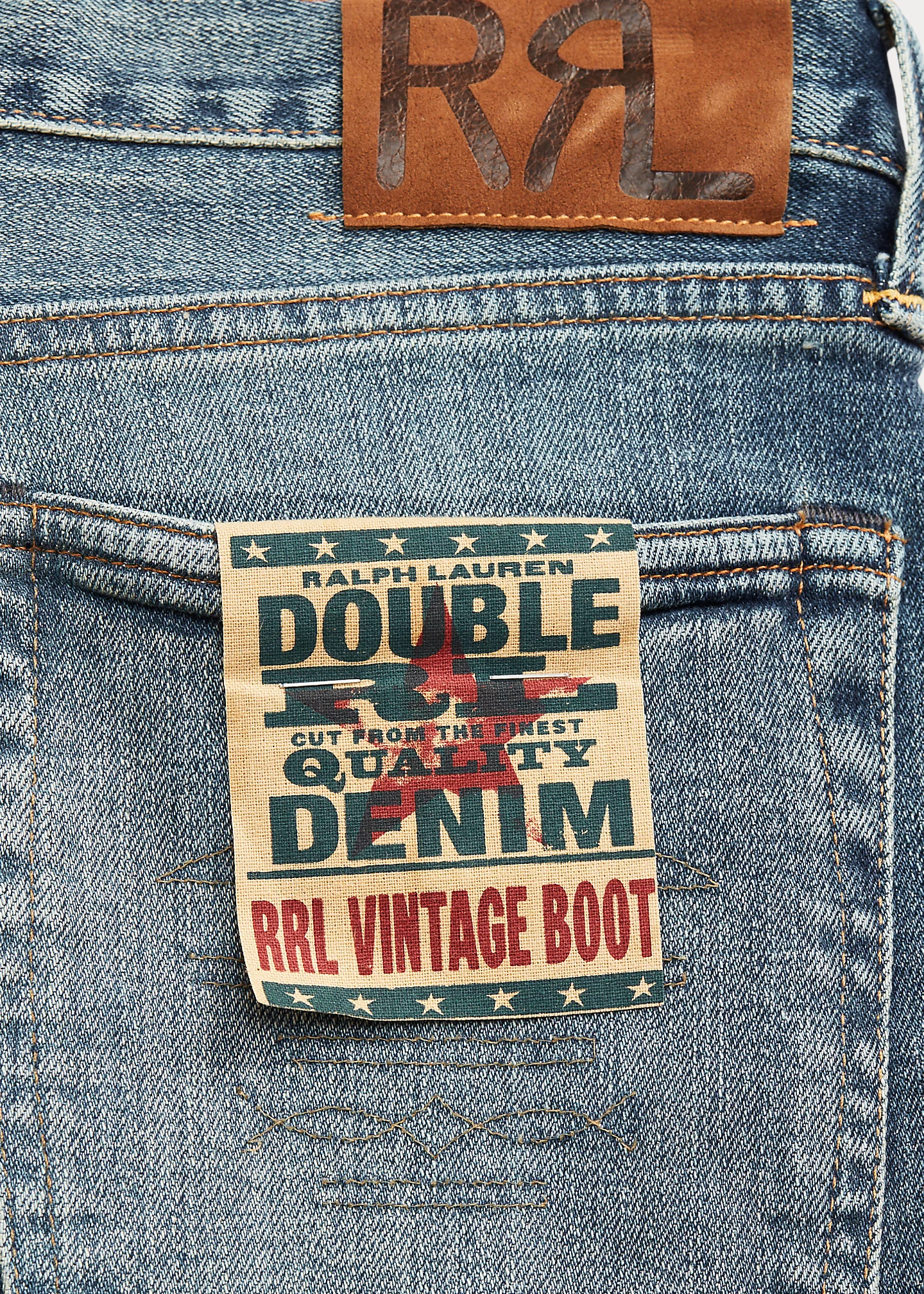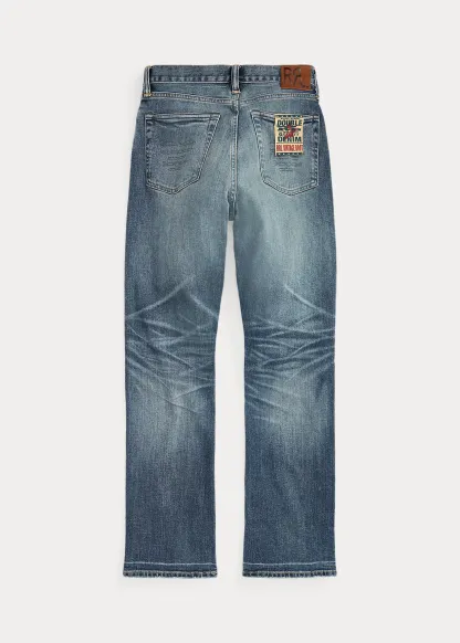 - Belt loops. Zip fly with a signature buttoned closure. American-made buttons, rivets, and washer burrs. Five-pocket styling. "RRL" embroidery at the coin pocket. “RRL”-debossed logo patch at the back right waist.