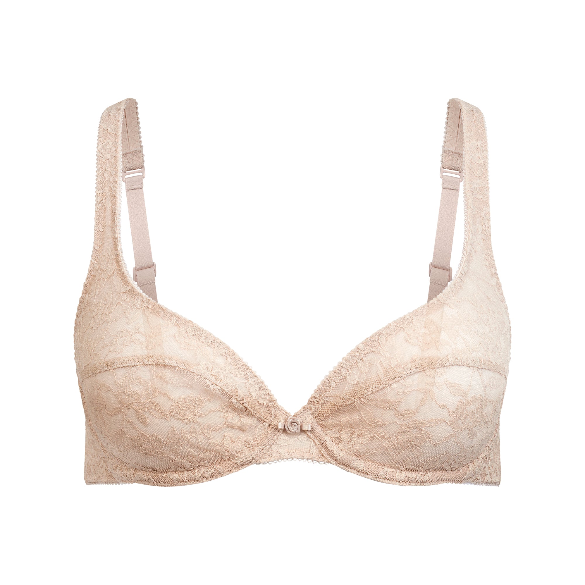 Ultra-feminine and timeless. Designed in our vintage-inspired lace, this unlined bra features a supportive underwire and bold, pointed cups for a striking statement. Elevated with picot elastic trim and a center front rosette, this solution comes complete with adjustable straps and a hook and eye back closure. Fits true to size.