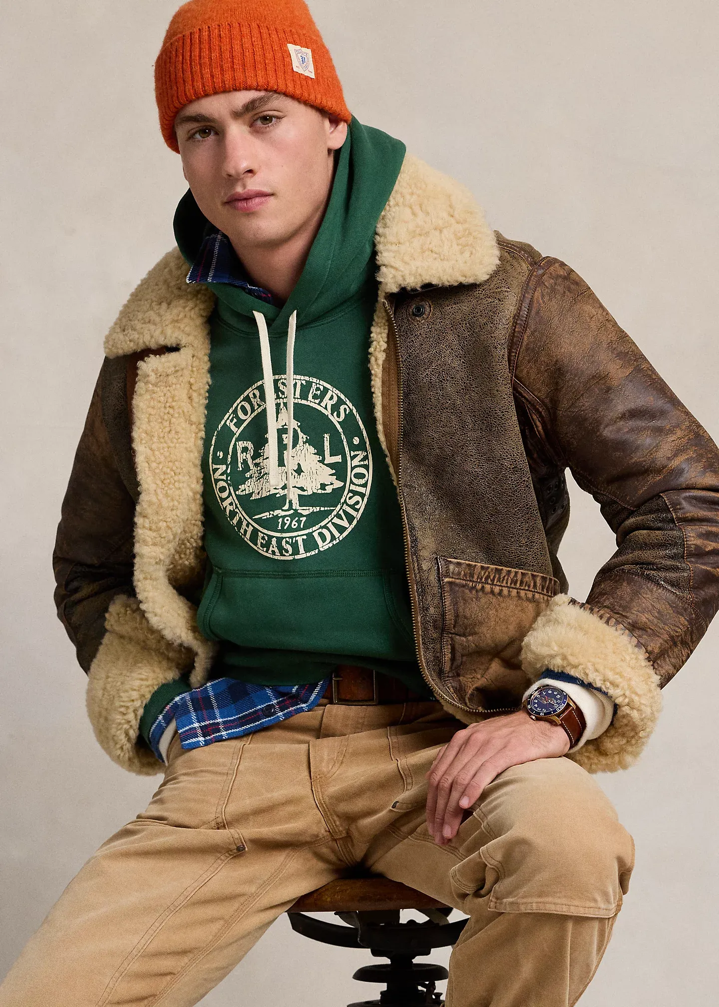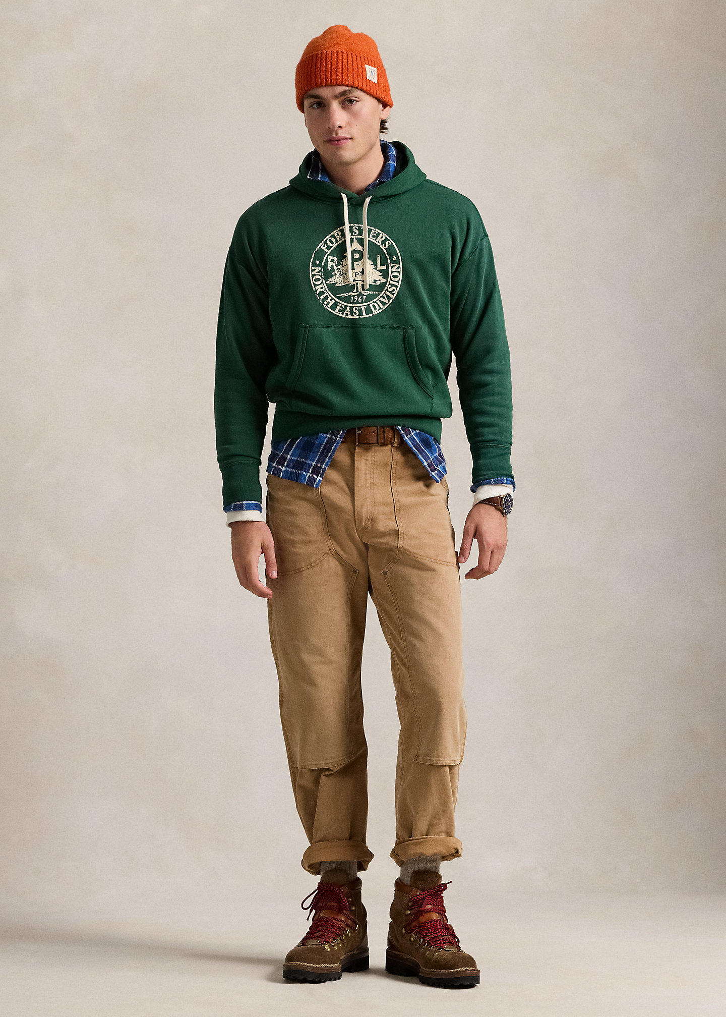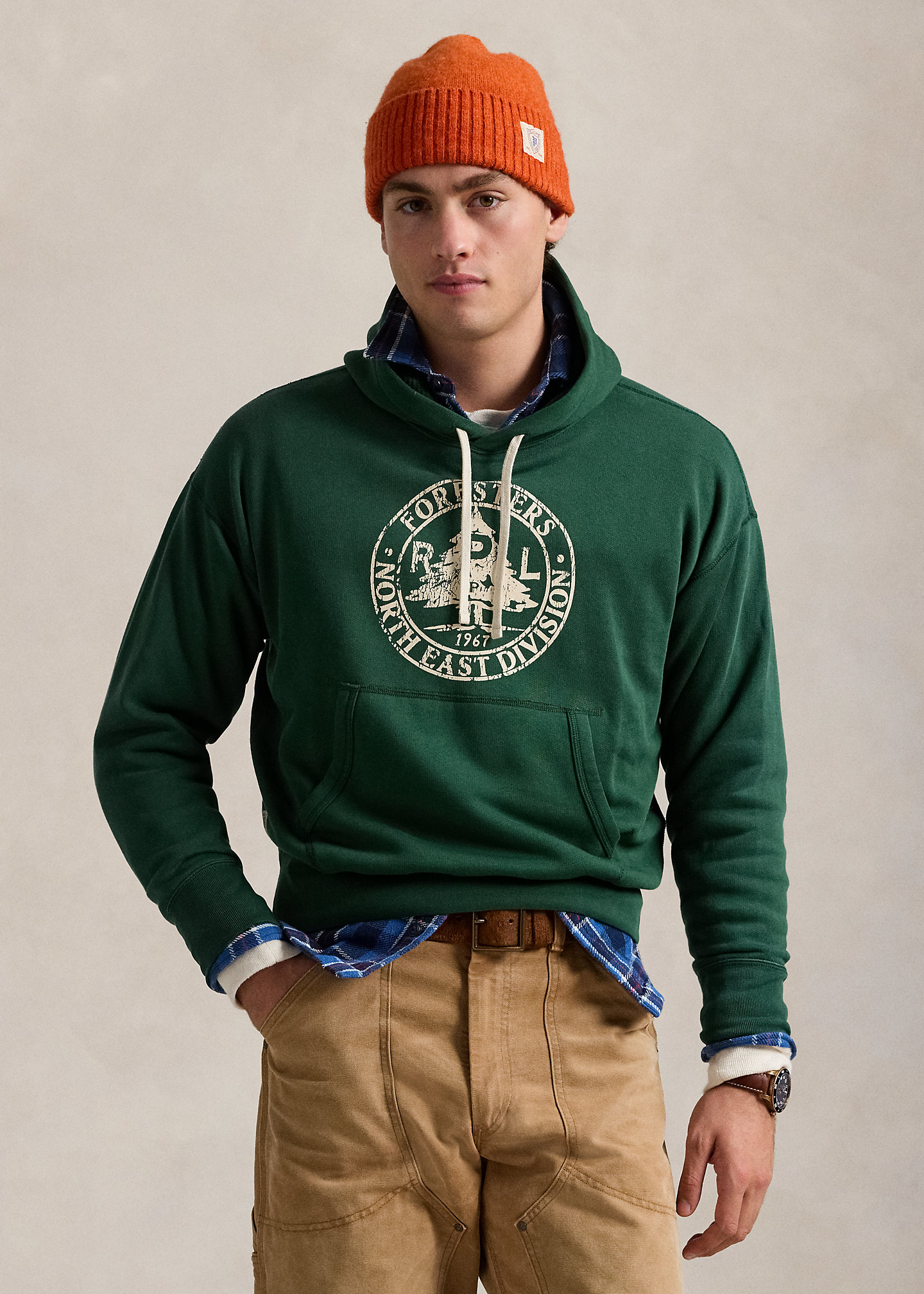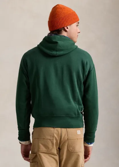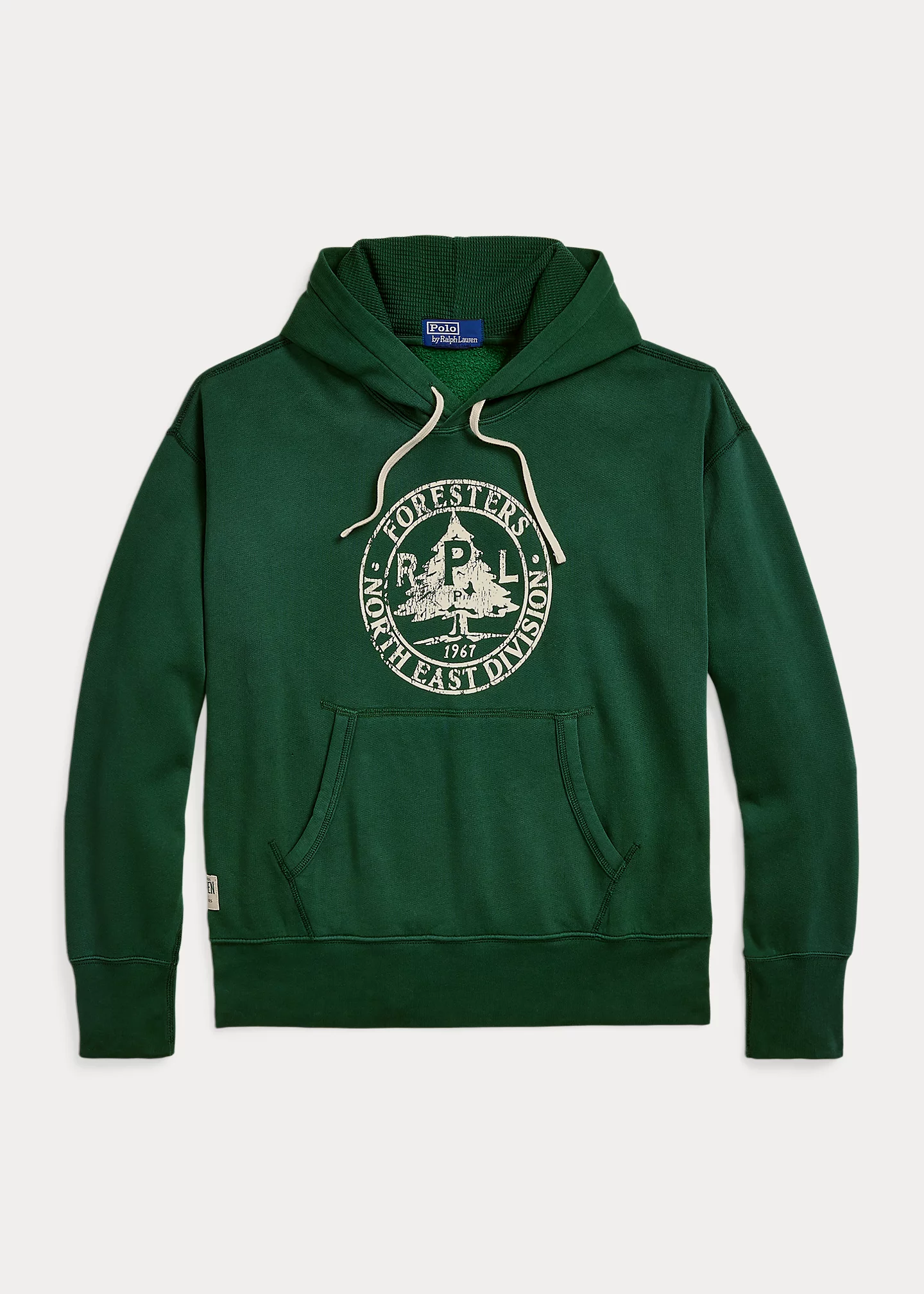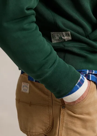 - Kangaroo pocket. "Polo Ralph Lauren Outdoor Supplies" label at the right hem. Ribbed hem.