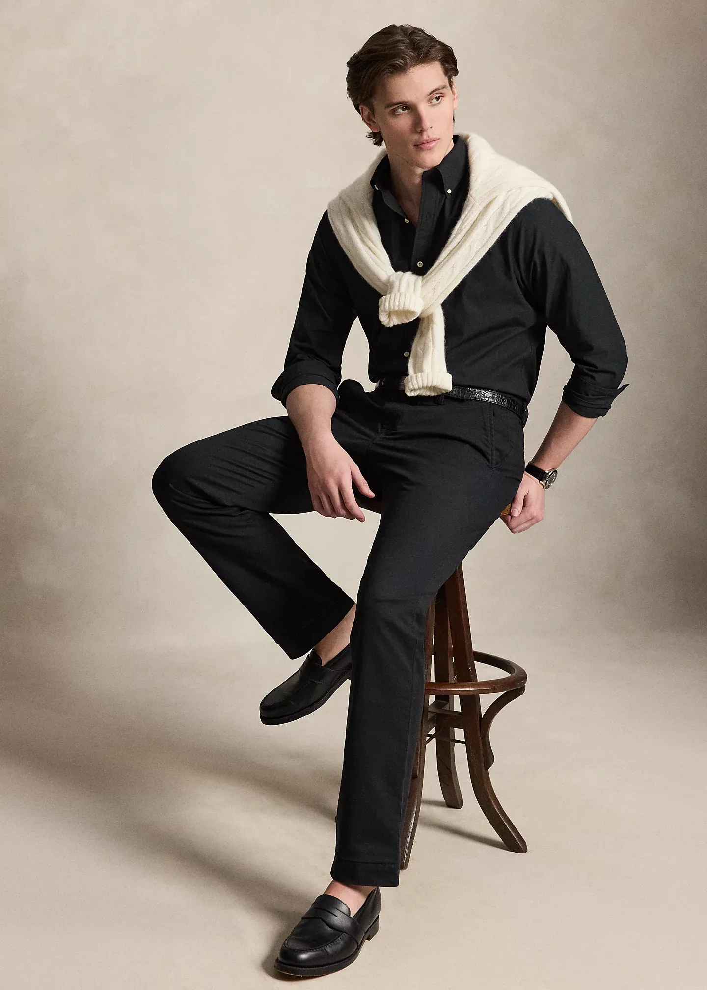 - Belt loops. Zip fly with a buttoned closure.
