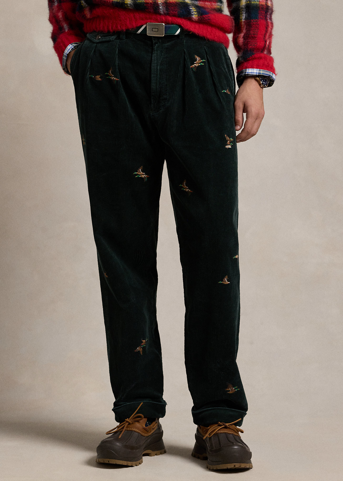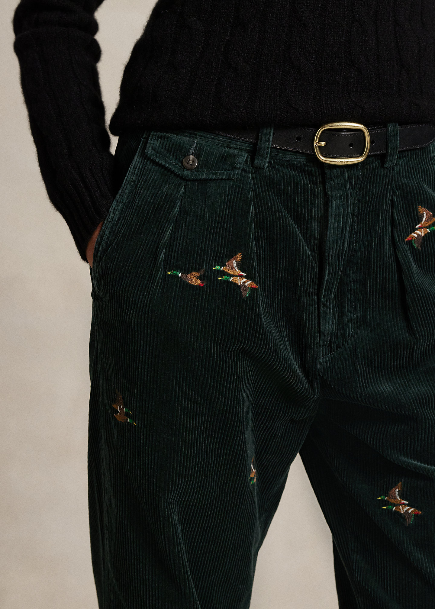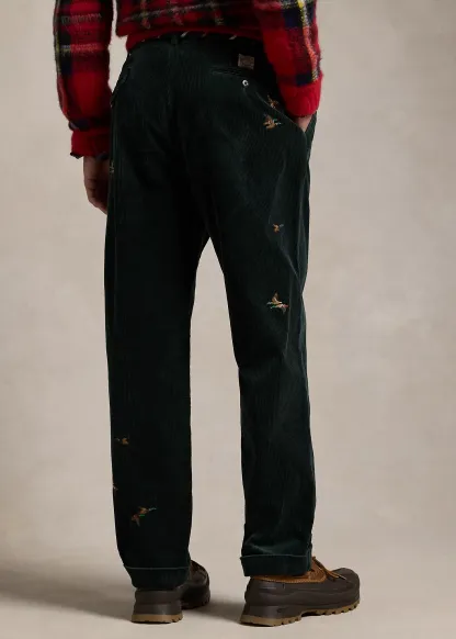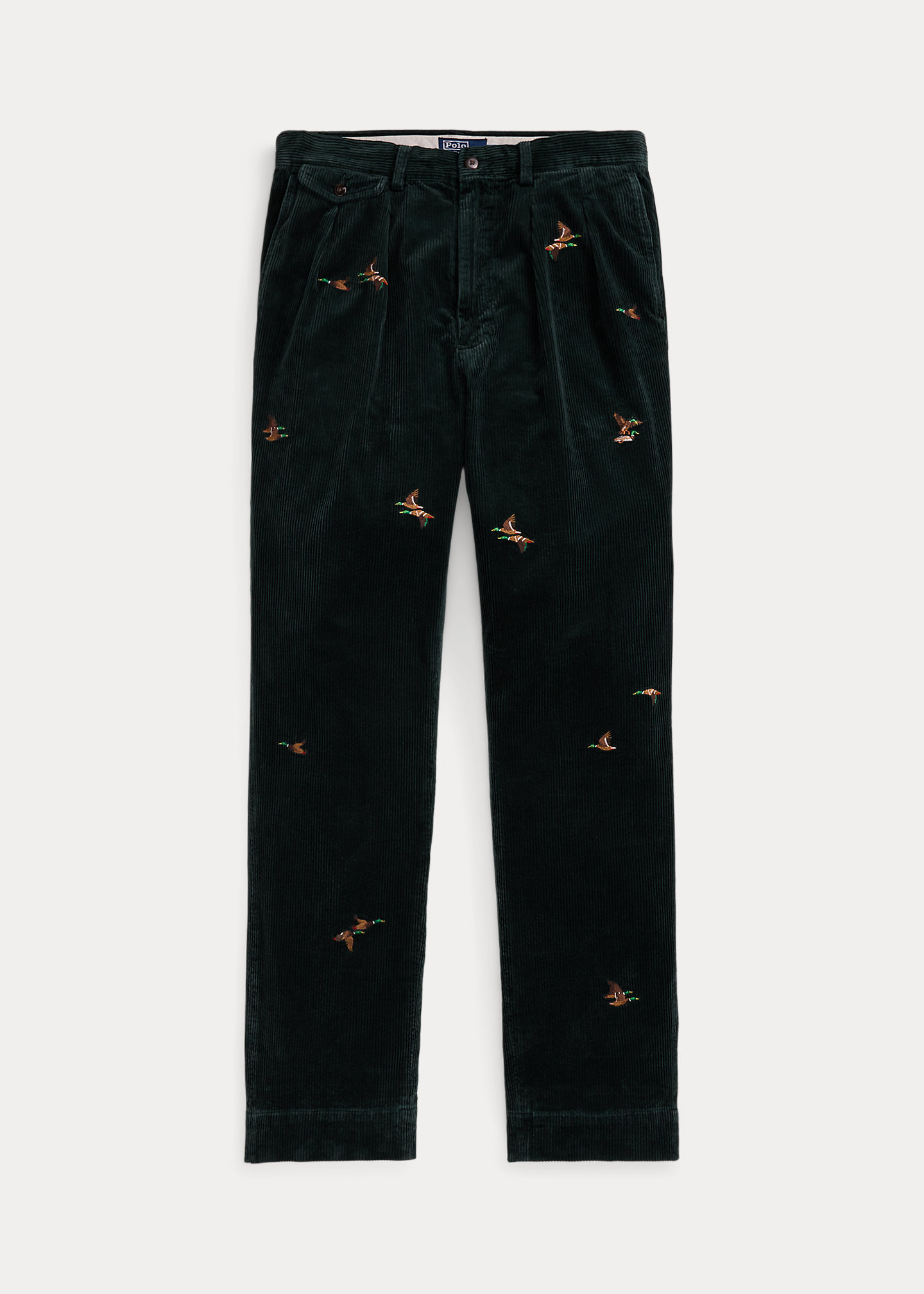 - Belt loops. Zip fly with a buttoned closure. Double-pleated front. Duck motif embroidered all over. Two front angled pockets. Right hip ticket pocket. Two back buttoned pockets. “Polo Chino Ralph Lauren” label above the back right pocket. Cuffed hems.