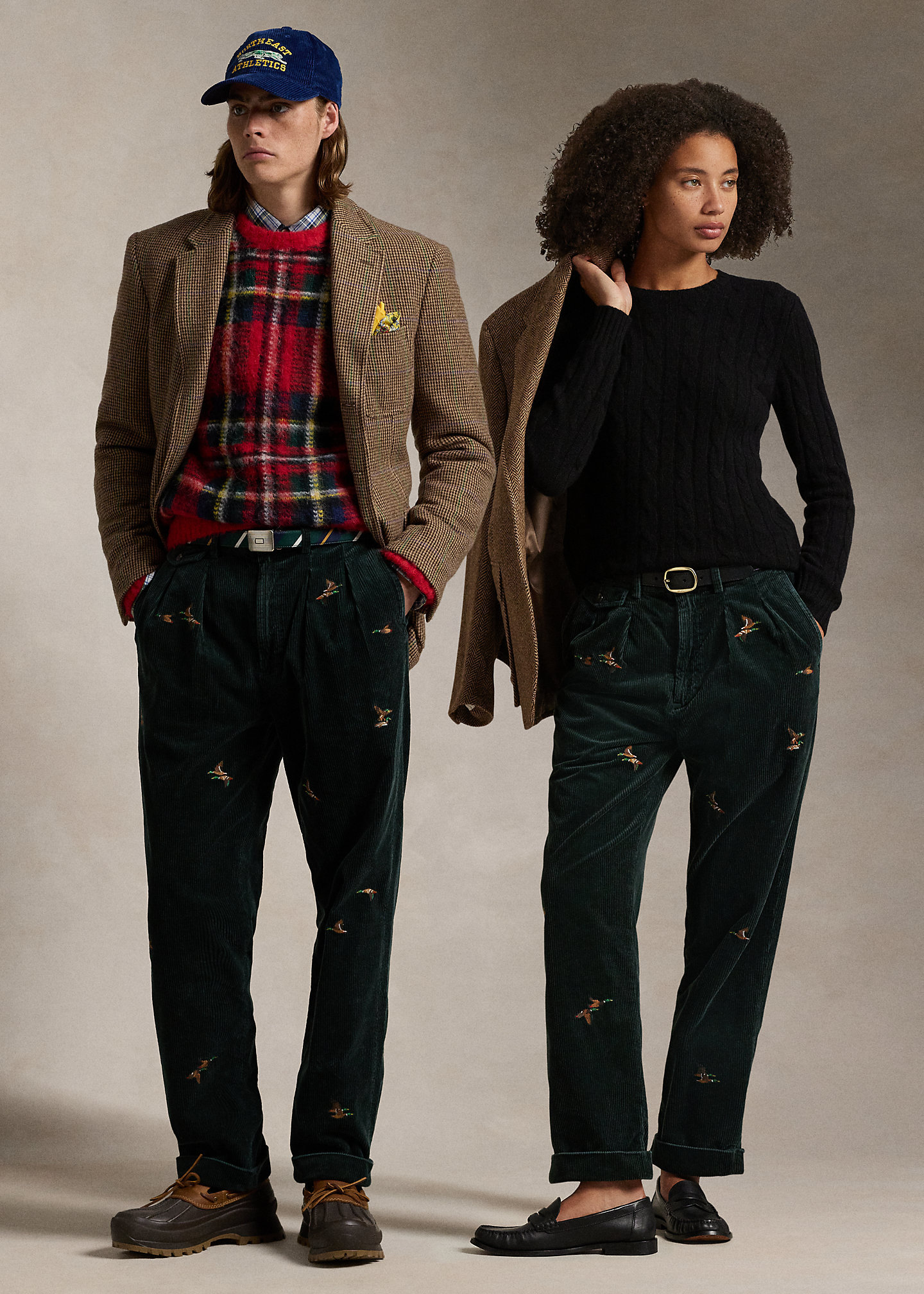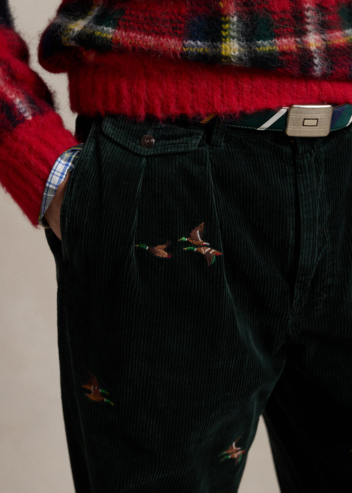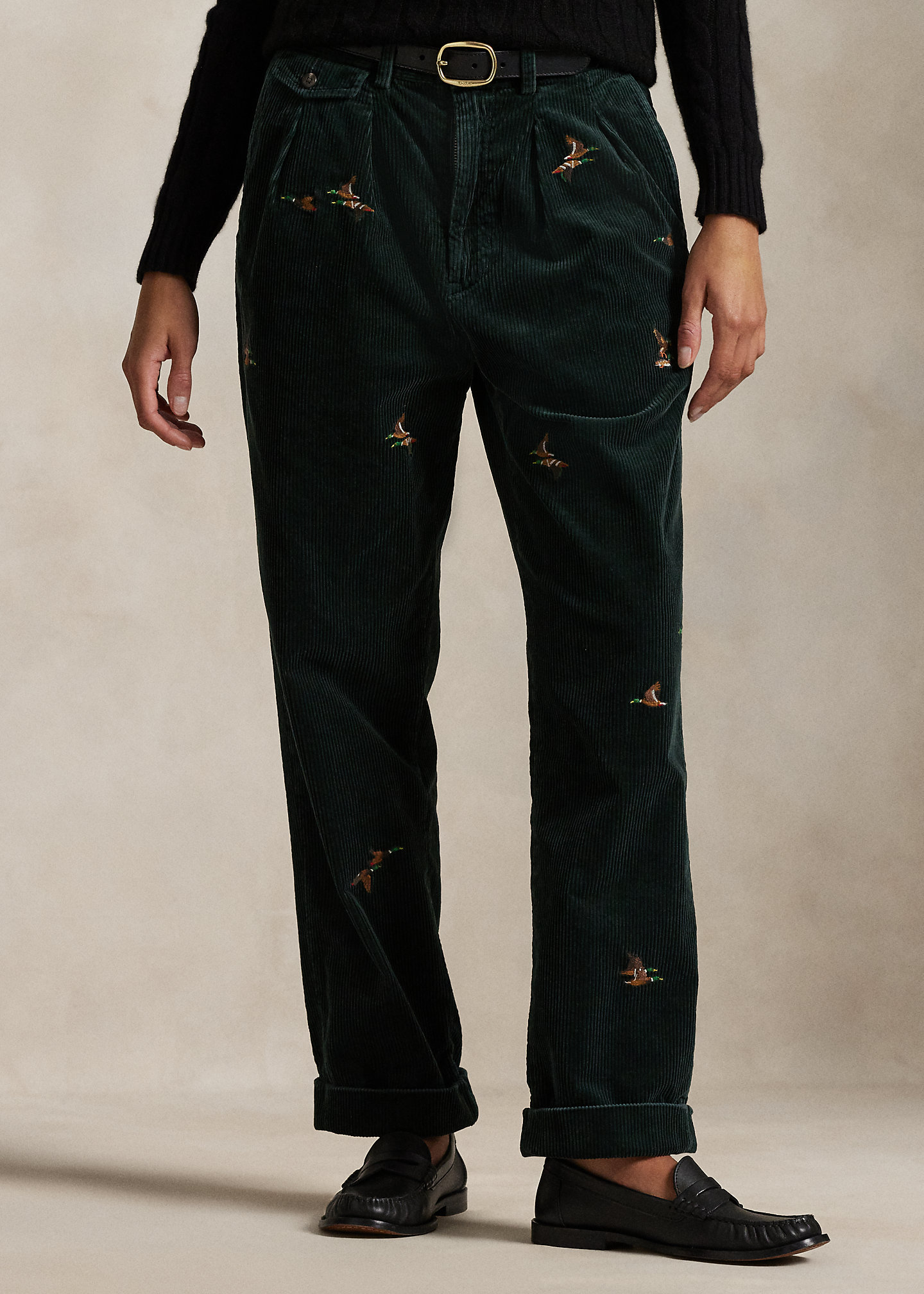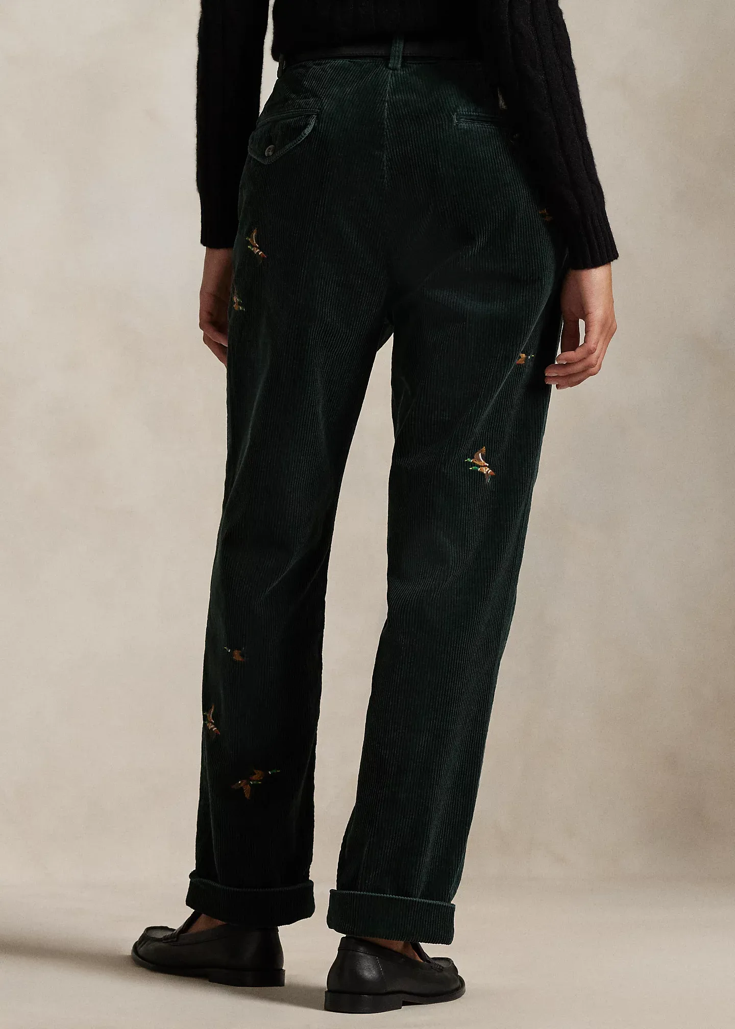 - Belt loops. Zip fly with a buttoned closure. Double-pleated front. Duck motif embroidered all over. Two front angled pockets. Right hip ticket pocket. Two back buttoned pockets. “Polo Chino Ralph Lauren” label above the back right pocket. Cuffed hems.