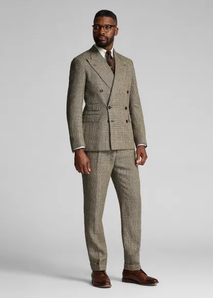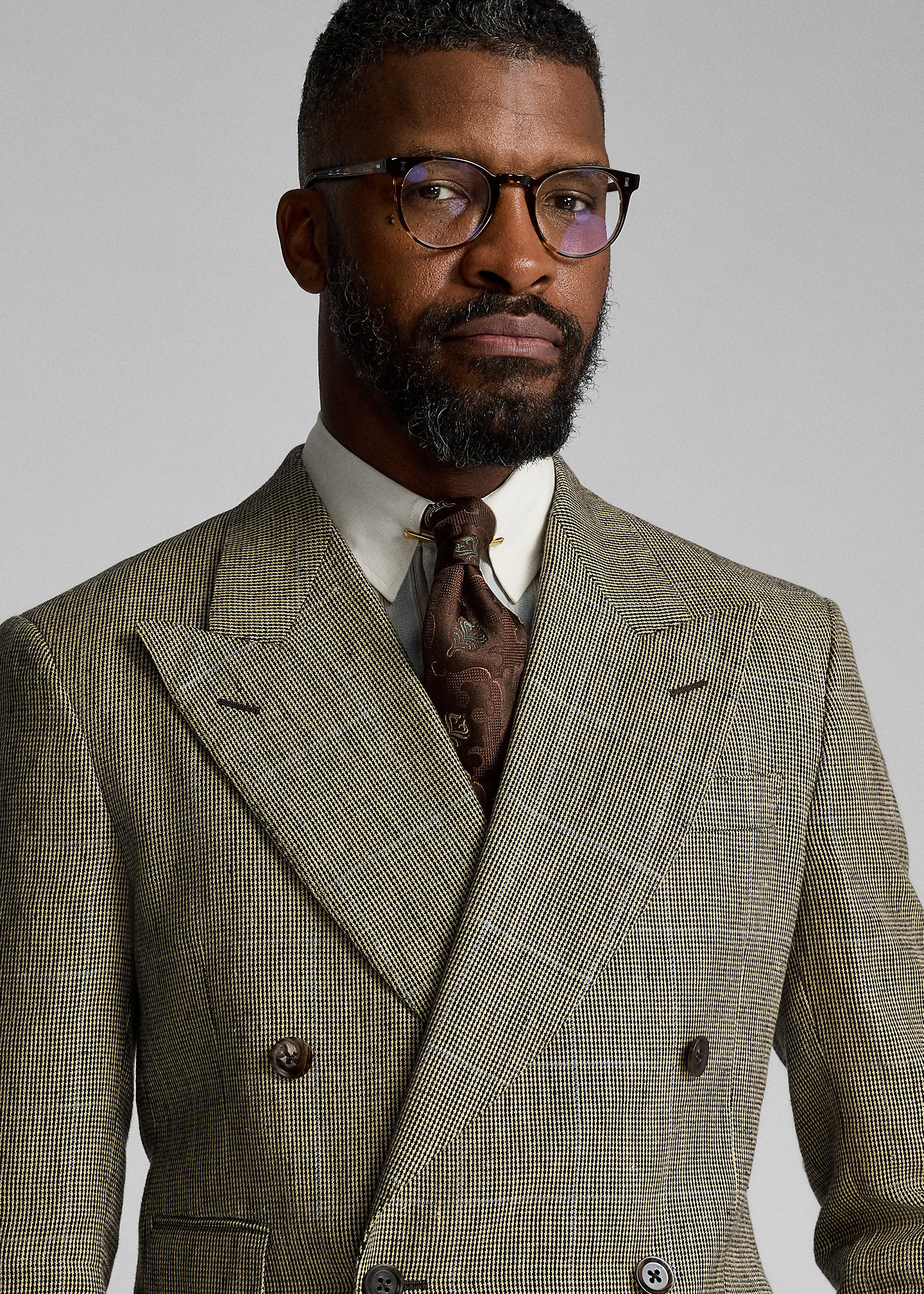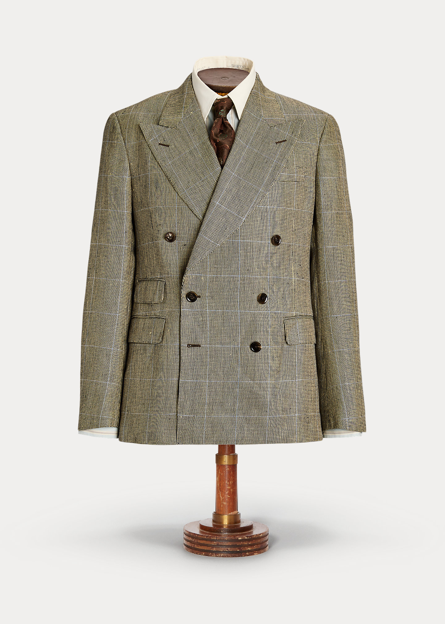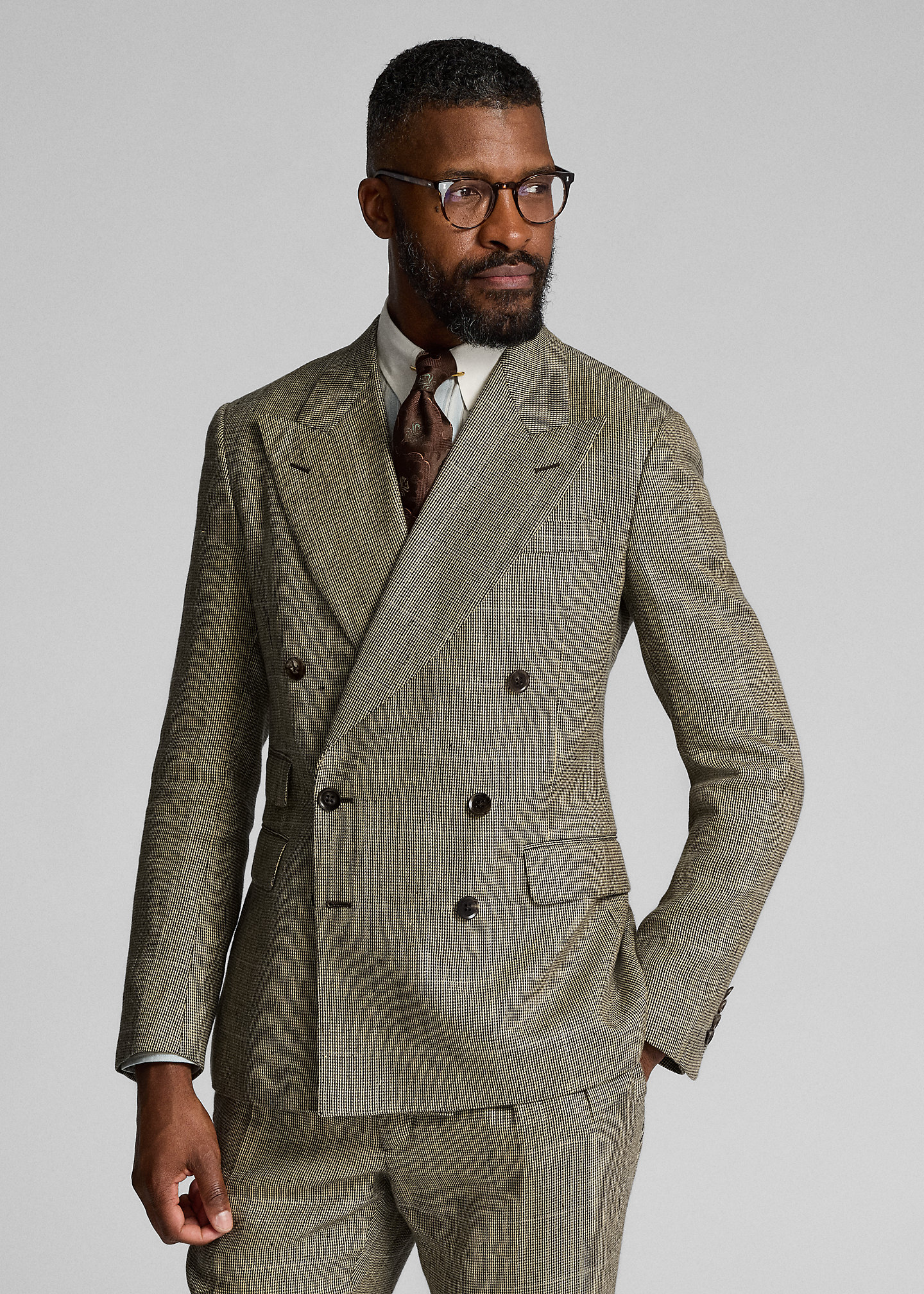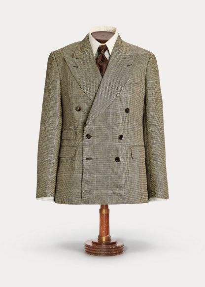 - Peak lapels. Buttonhole at the left lapel. Double-breasted silhouette. Genuine horn buttons.