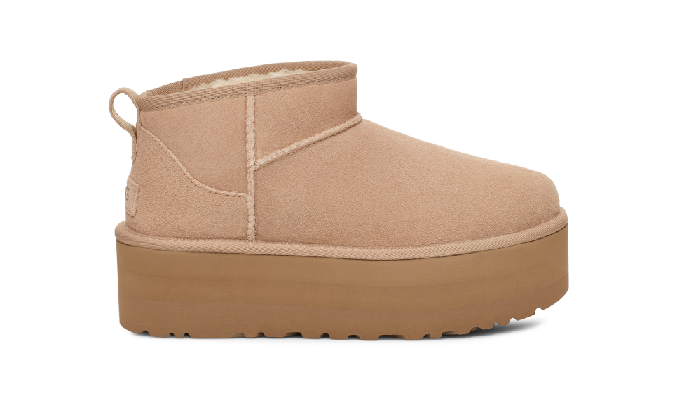 - The UGG® logo, embossed suede heel label
