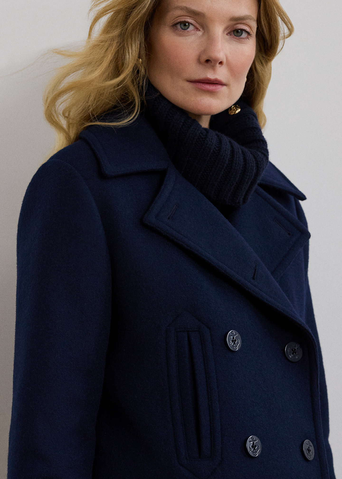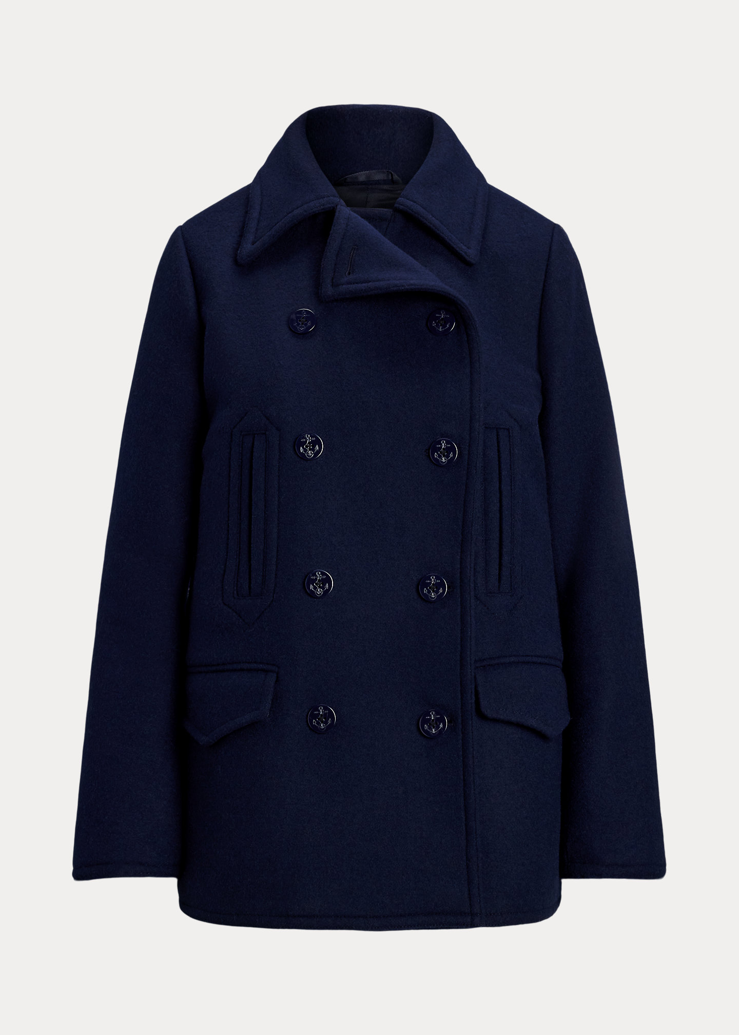 - Notch lapels. Double-breasted silhouette. Anchor-engraved buttons.
