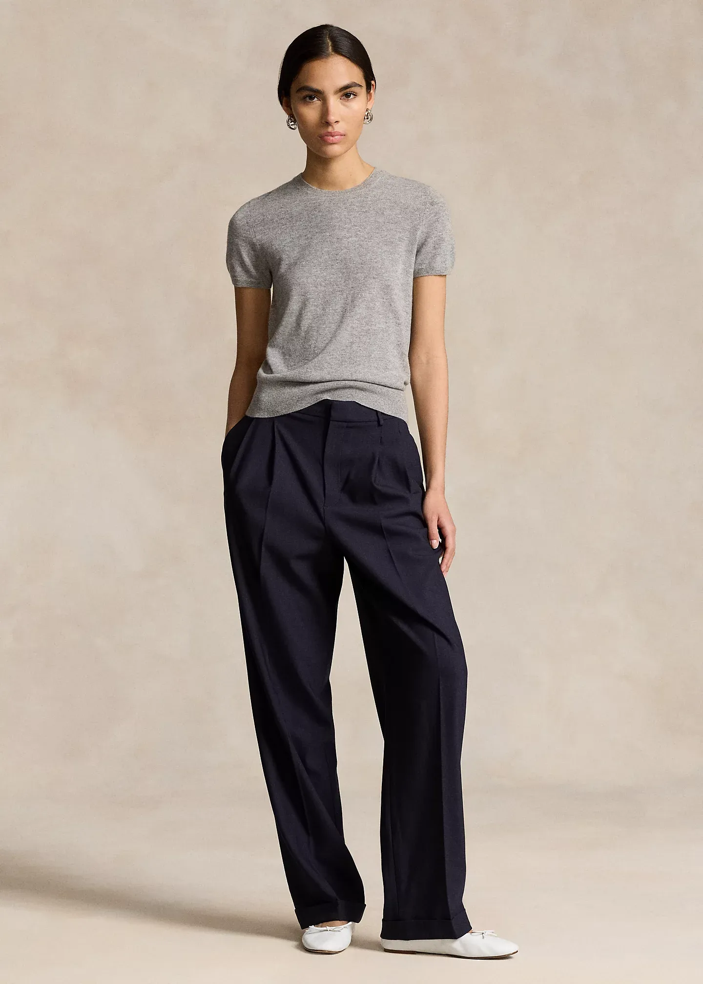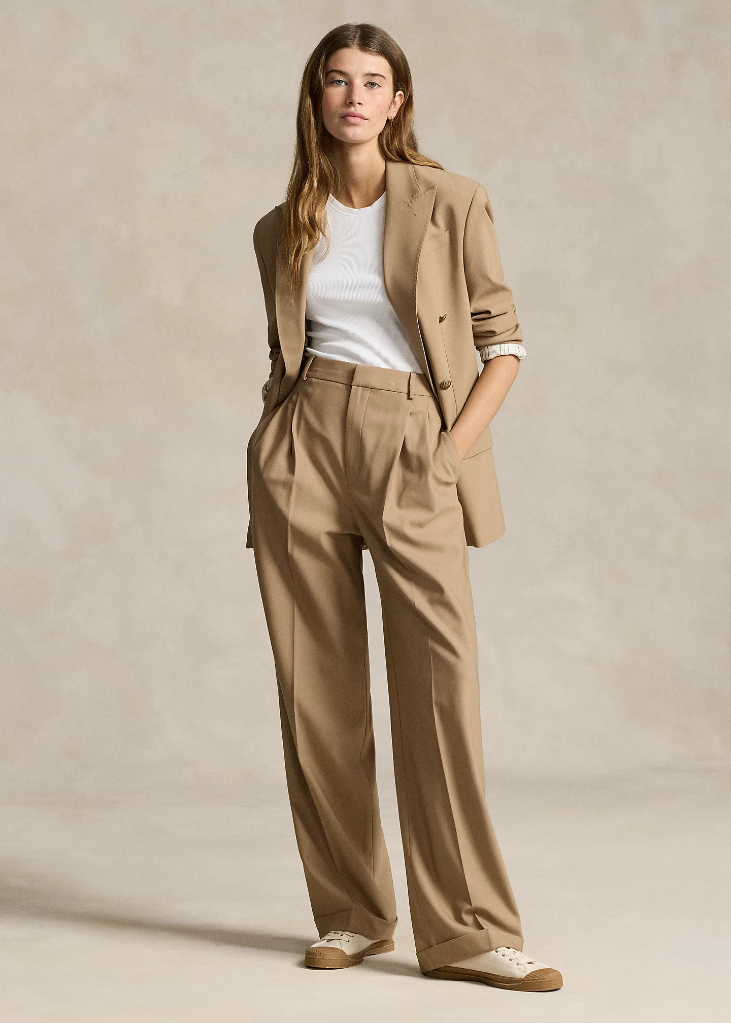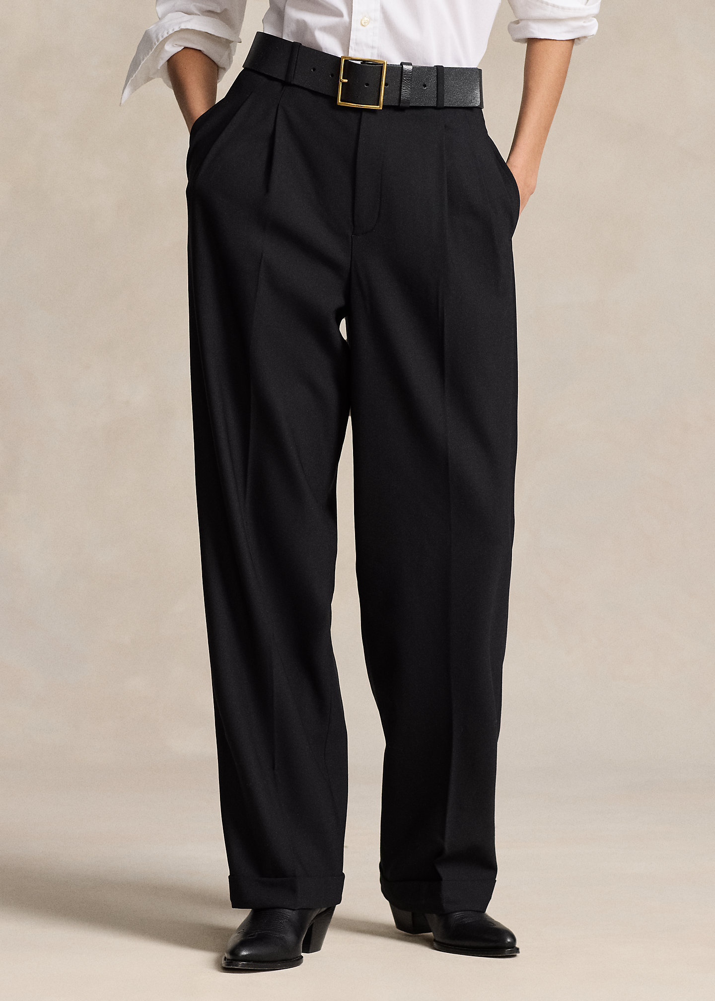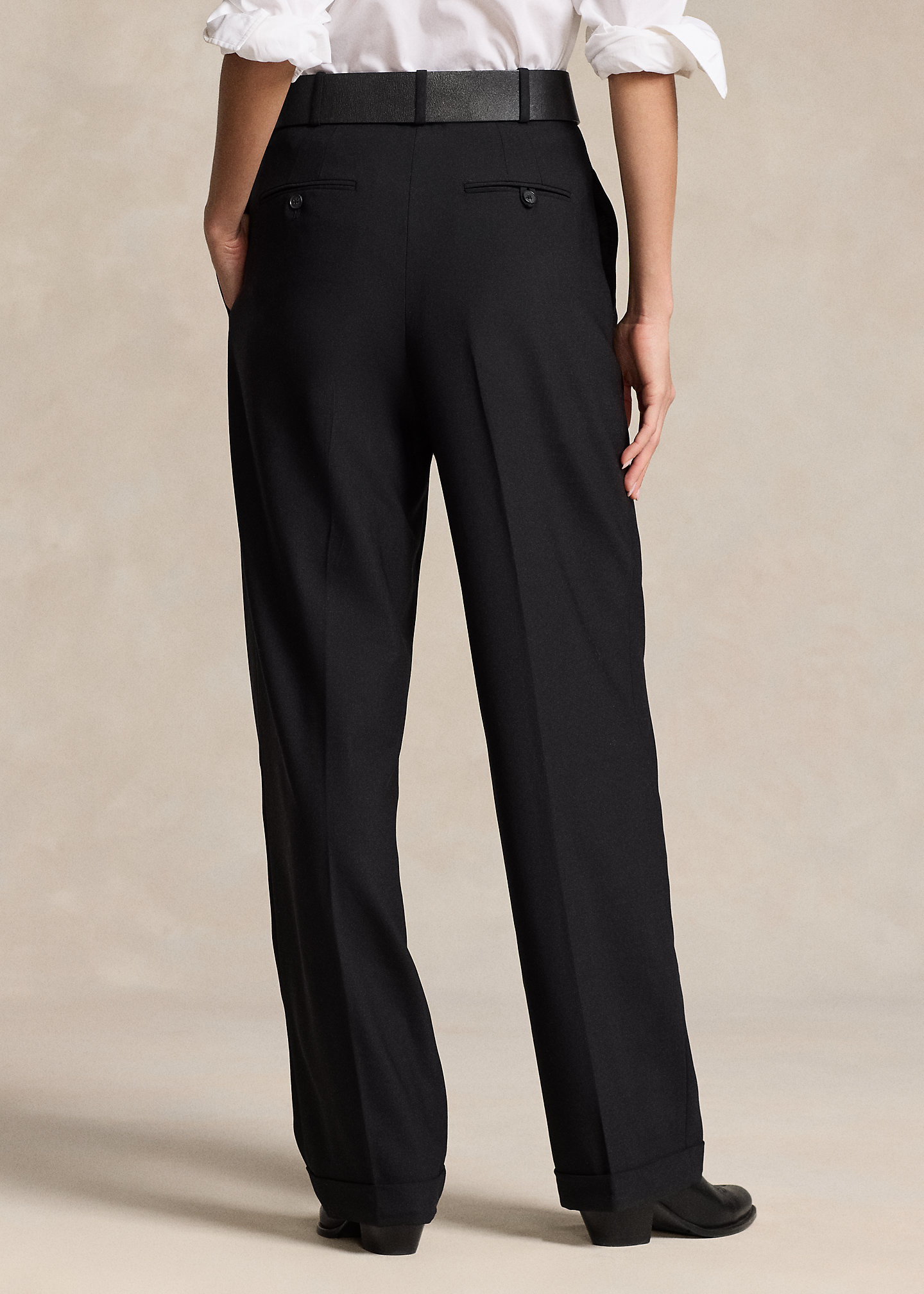 - Pleated front waist. Back waist darts.