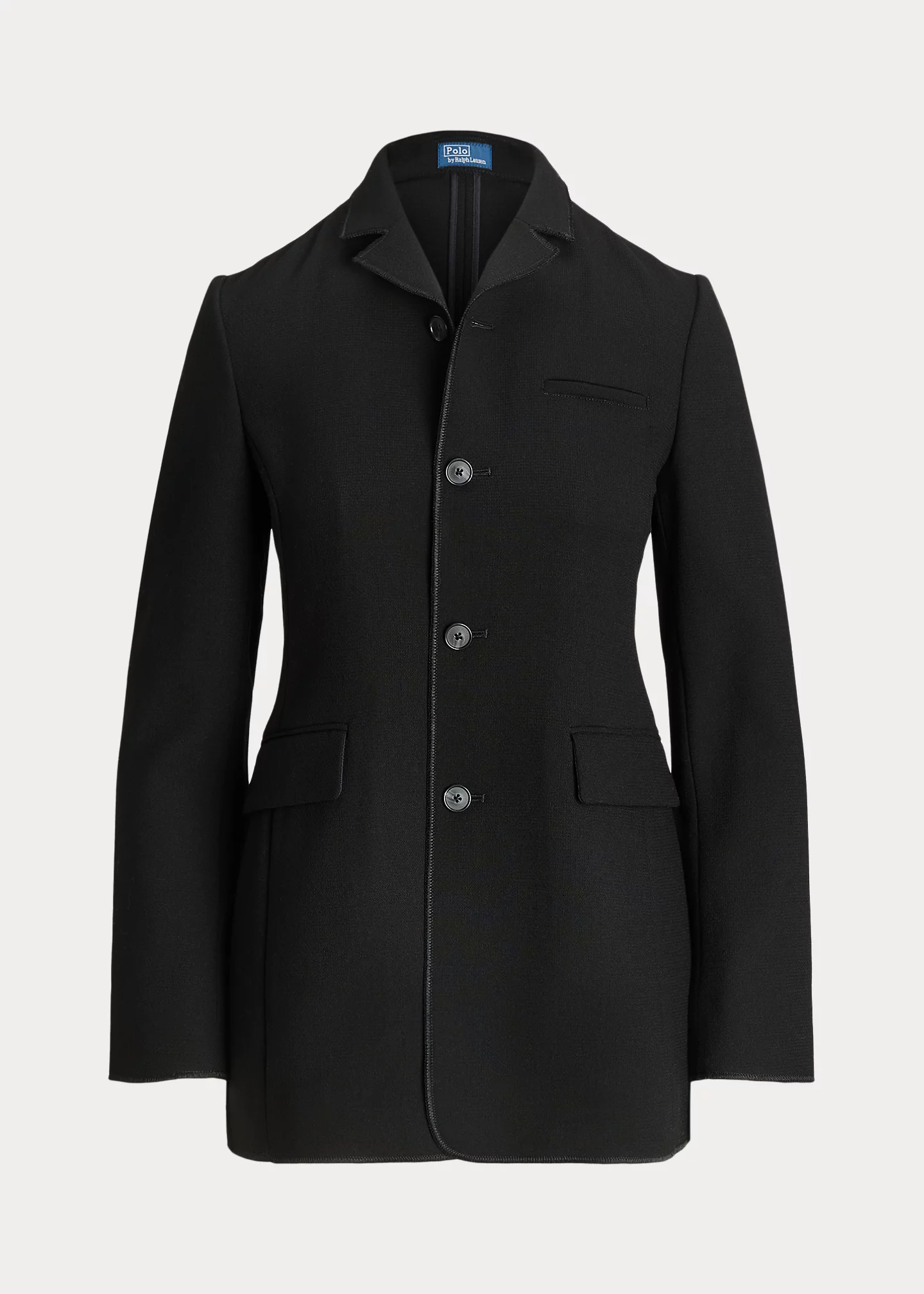 - High collar with notch lapels. Four-button placket.